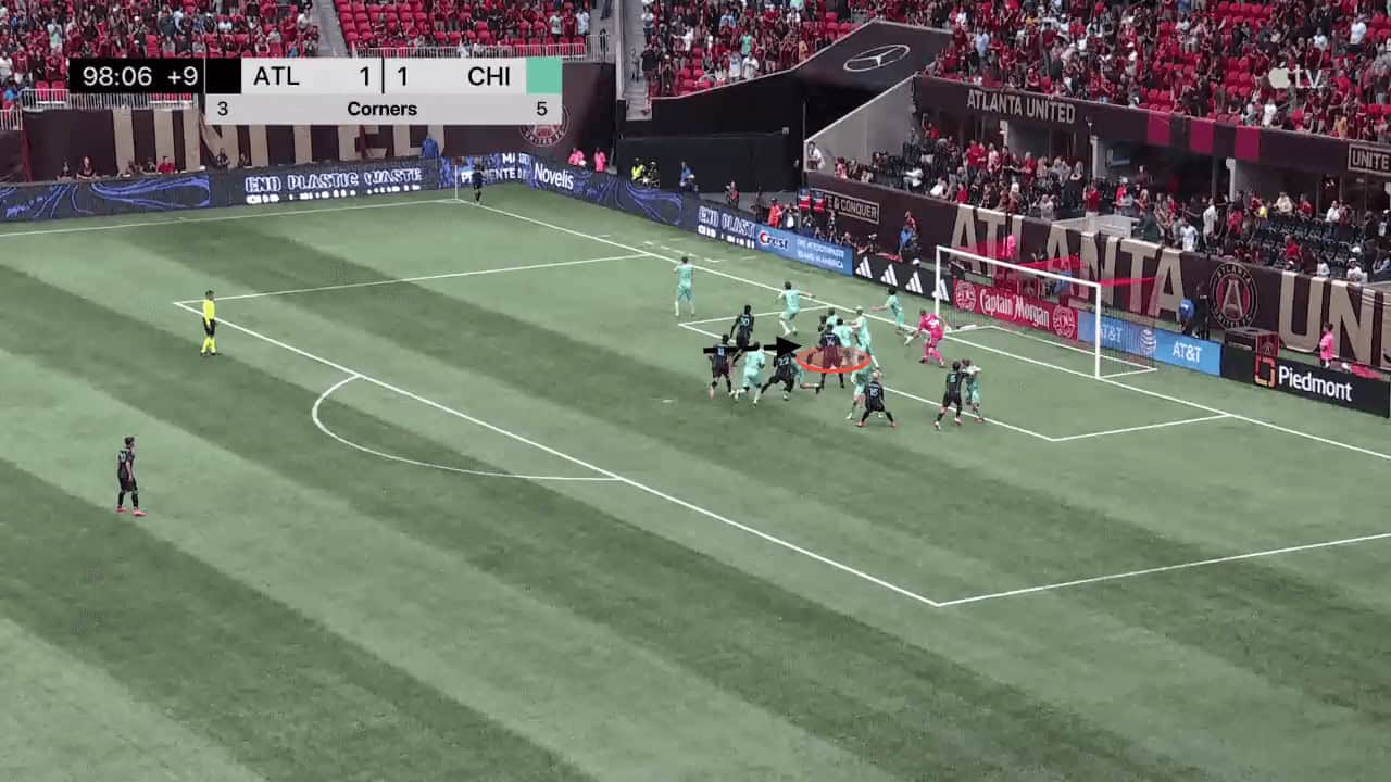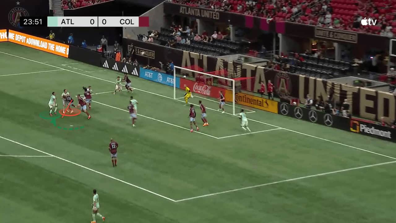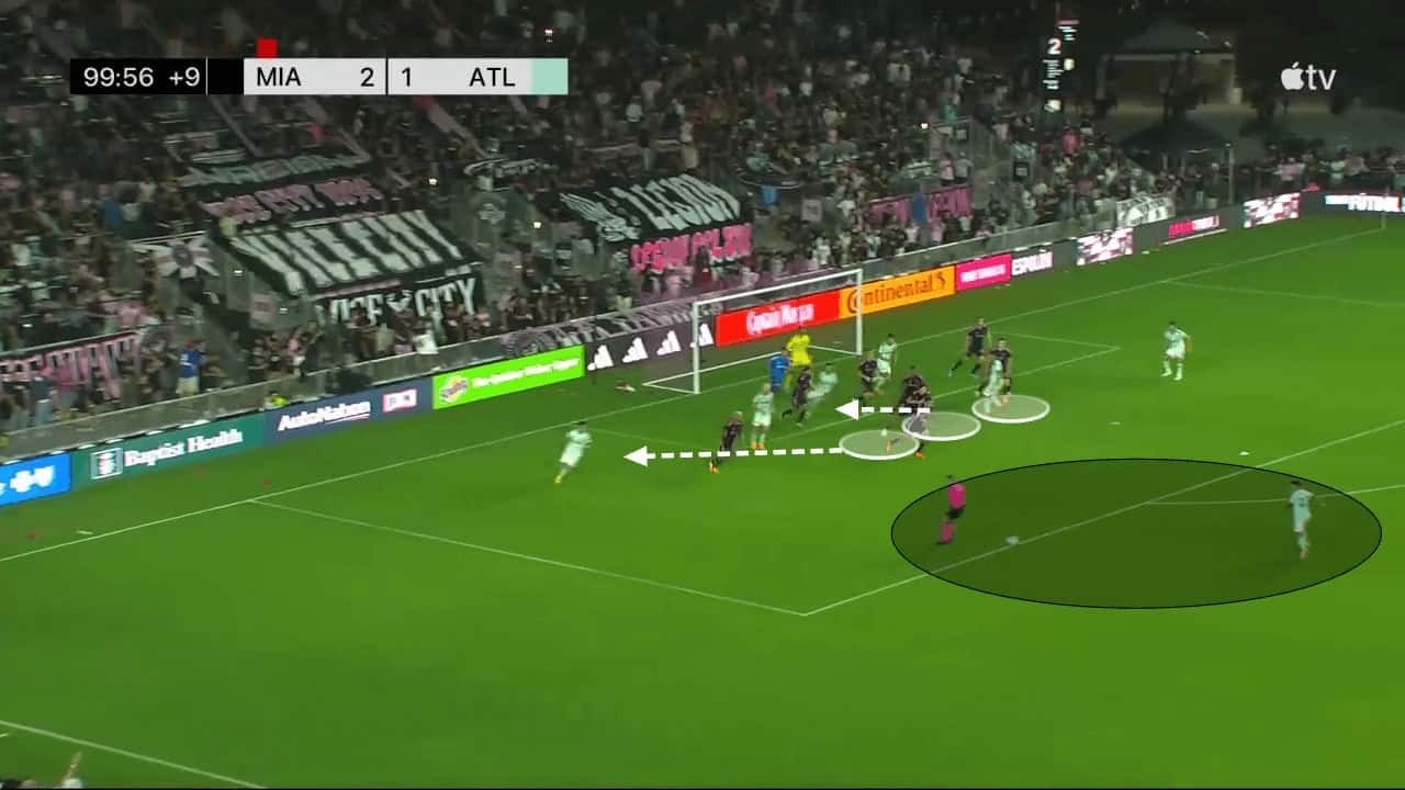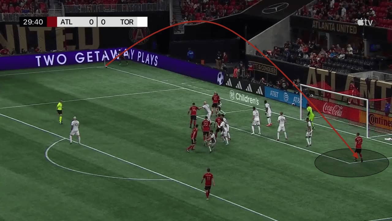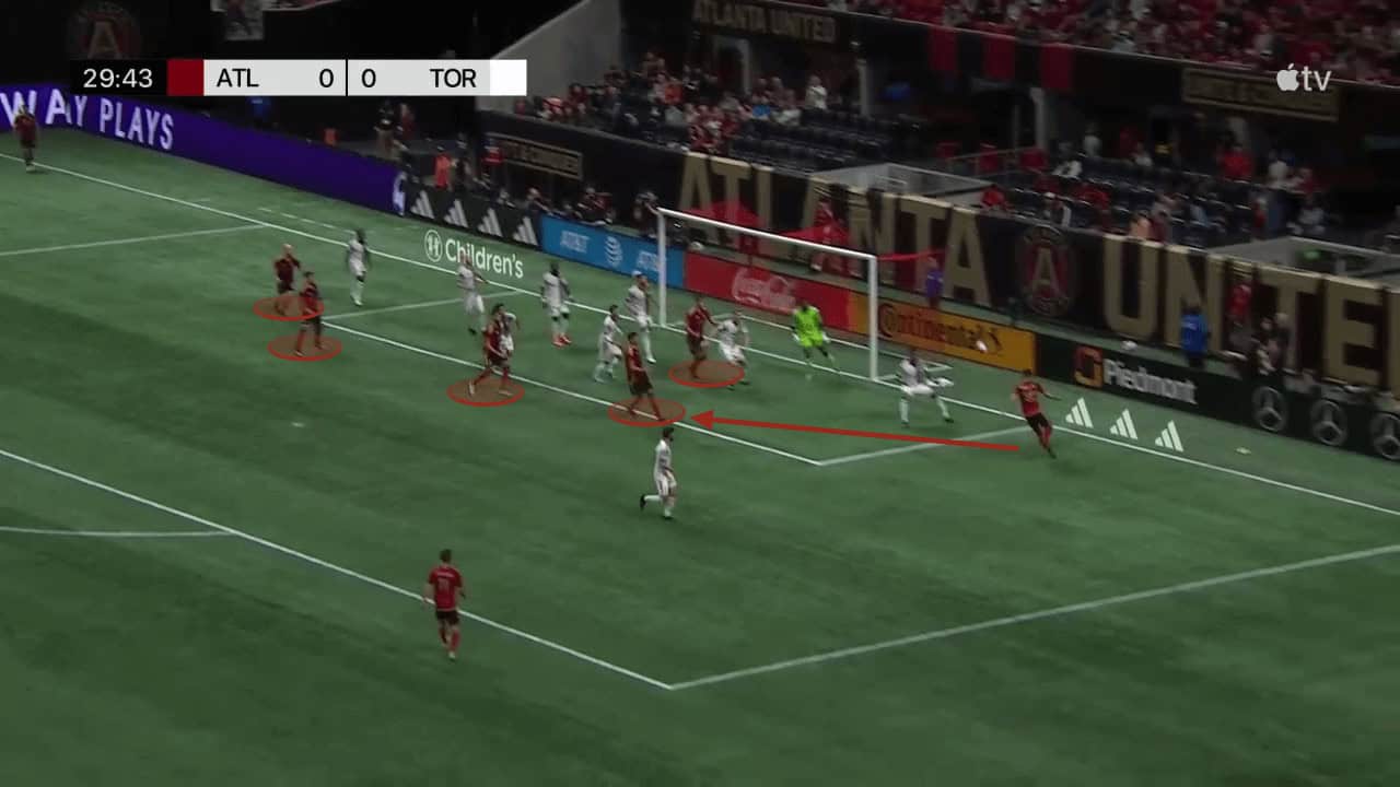 In this case, the hurried nature of defenders closing down the potential shot has left some attackers open in space which Almada uses to his advantage in order to deliver the ball into a more dangerous position inside the six-yard box. The lack of coordination in the defensive line stepping up is also used to Atlanta’s advantage where they move in the opposite direction to the Chicago Fire defenders to create additional space for themselves.