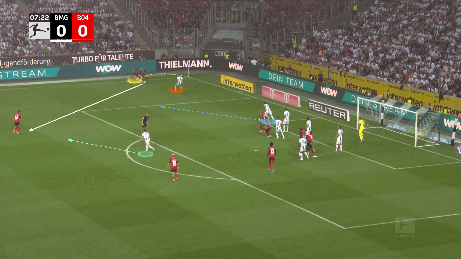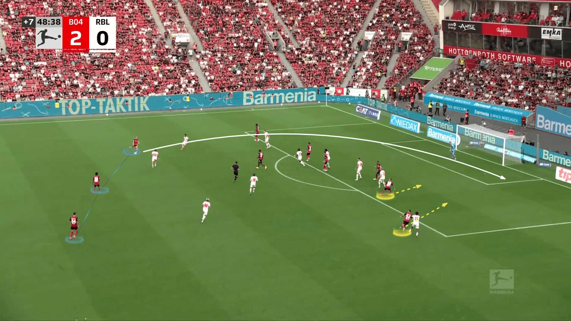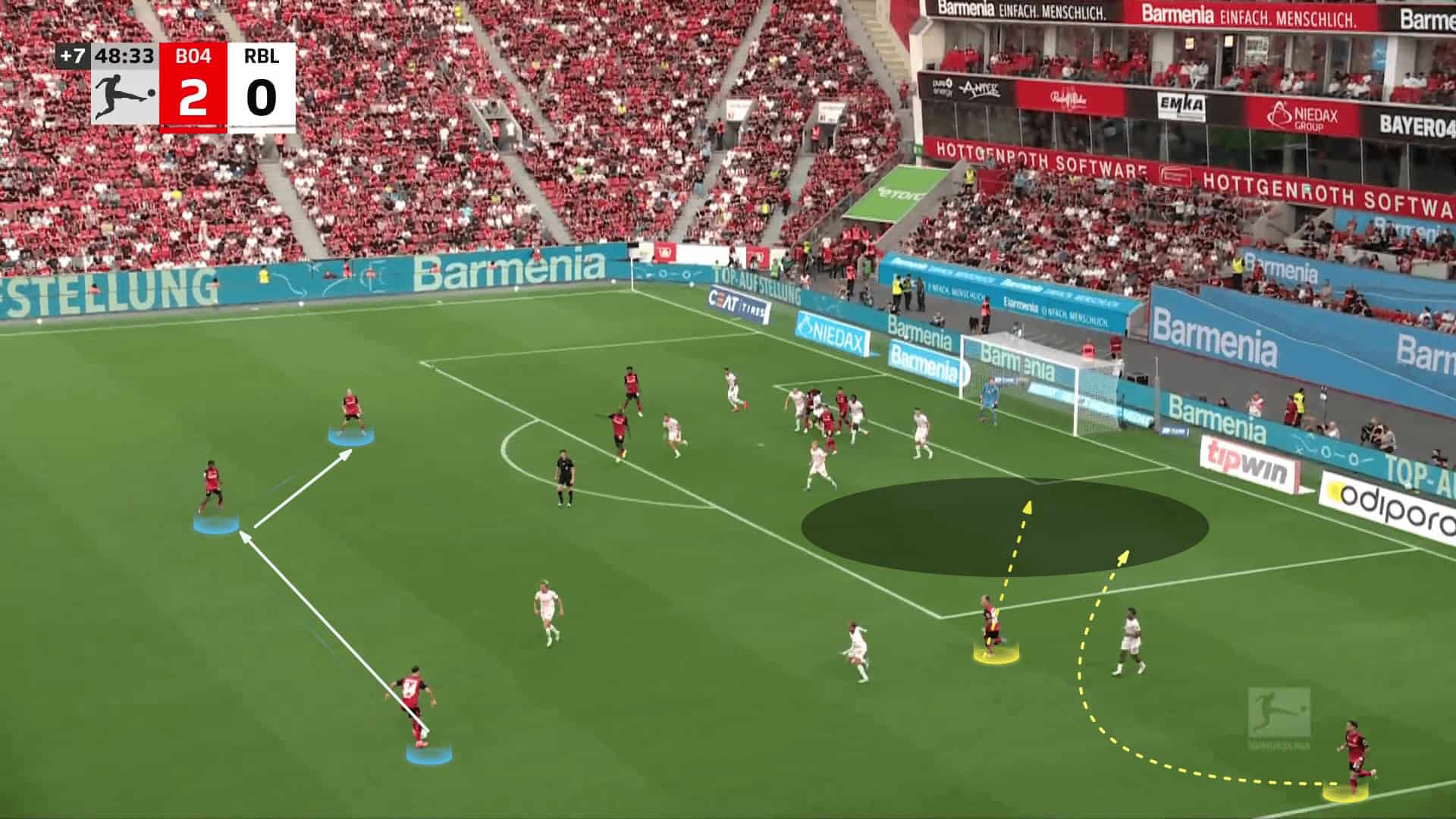 The same strategy applies below, but the first member of the triangle, usually Granit Xhaka, gets closer, dragging the rebound defender, leaving this area empty for Wirtz to shoot.