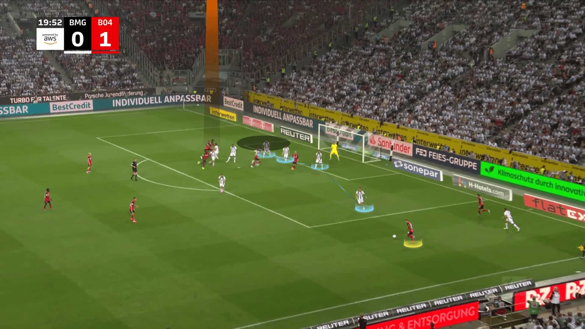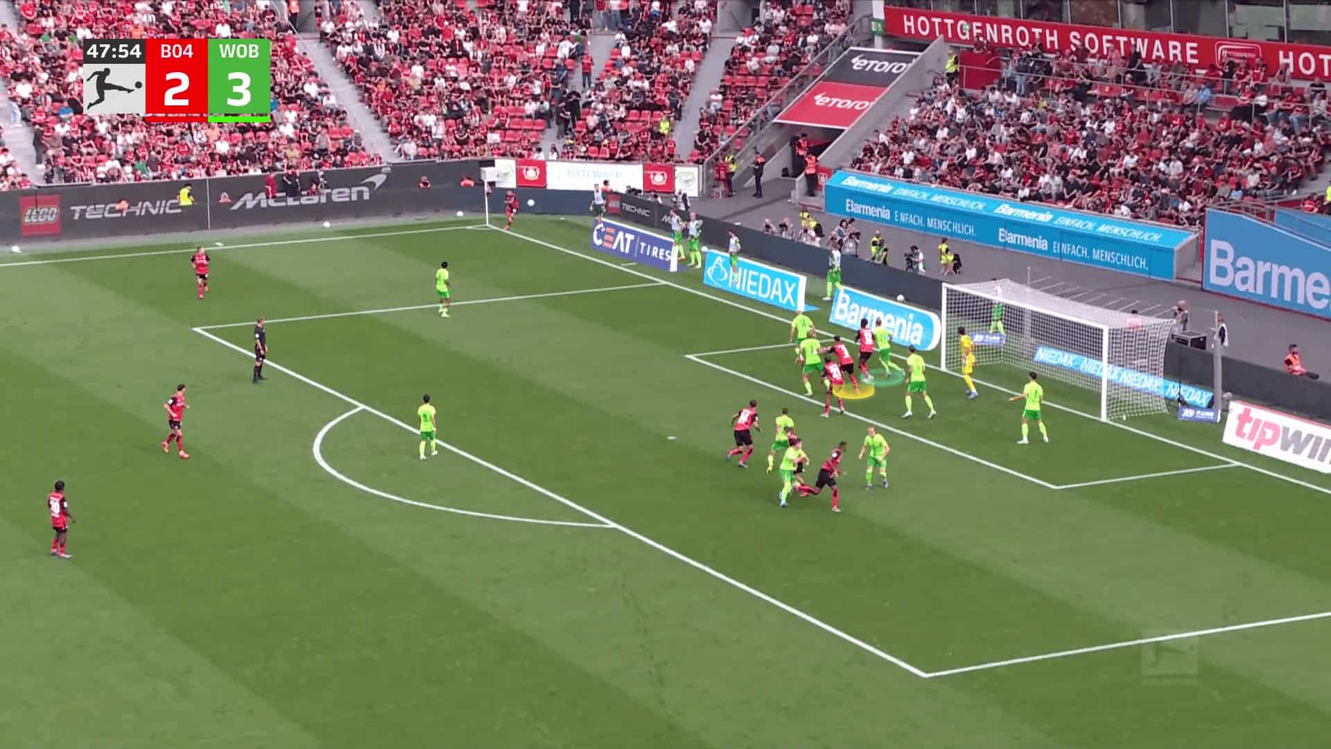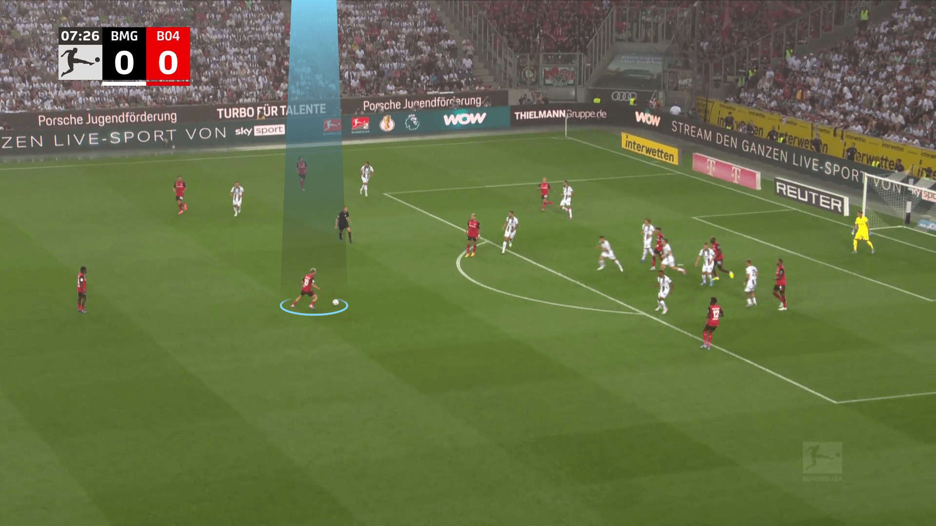 The same strategy applies below, but the first member of the triangle, usually Granit Xhaka, gets closer, dragging the rebound defender, leaving this area empty for Wirtz to shoot.