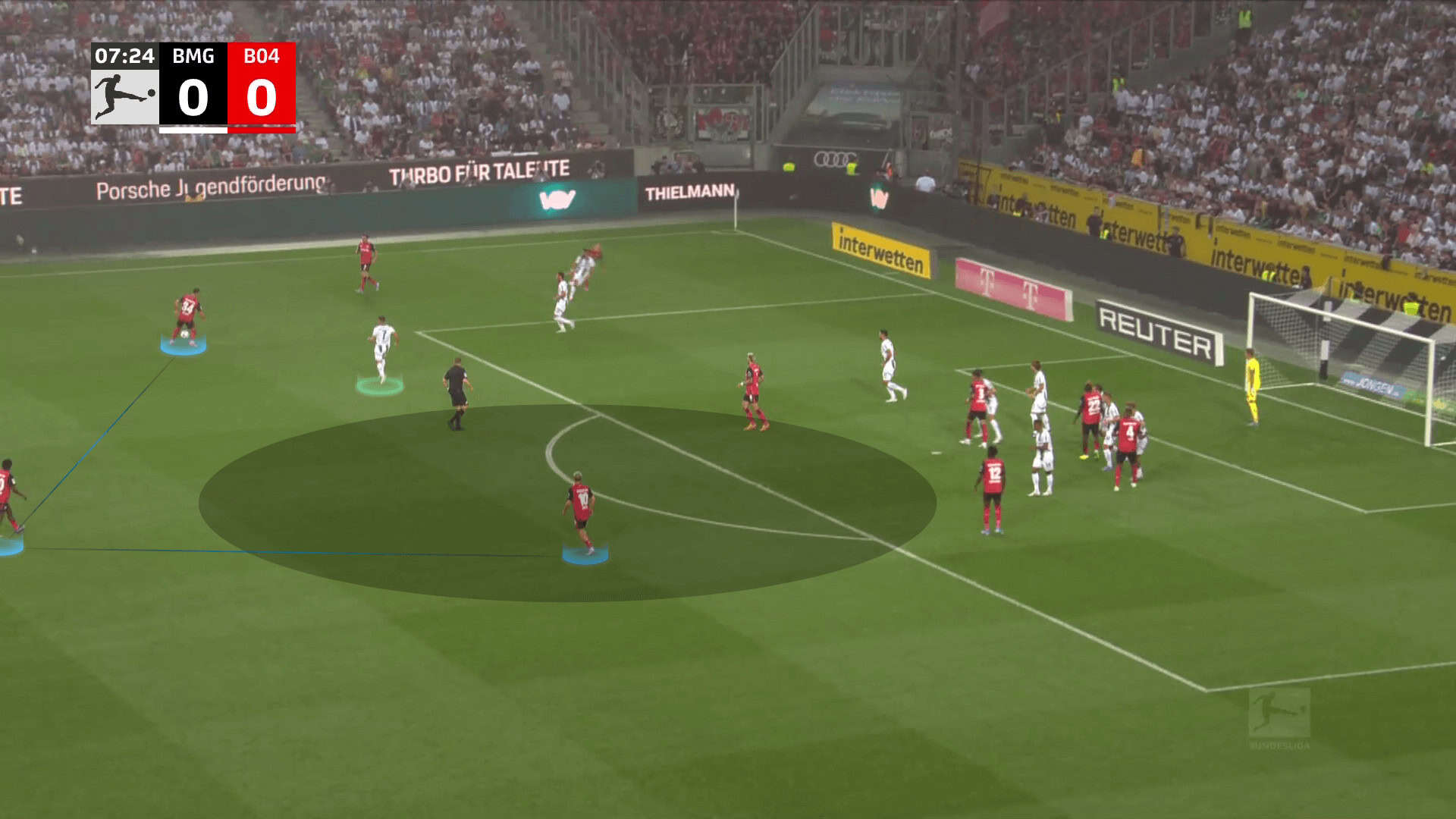 The second strategy Bayer Leverkusen uses is targeting the area behind the zonal line on the near post by players who initially stand between the zonal line and the goalkeeper, as shown below.