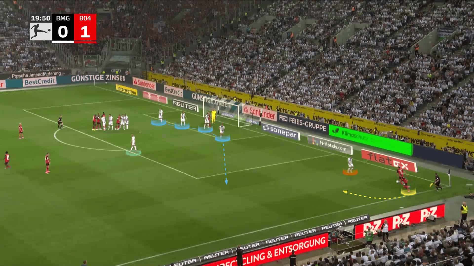 At free kicks, Leverkusen have a common strategy using two-taker manipulation.