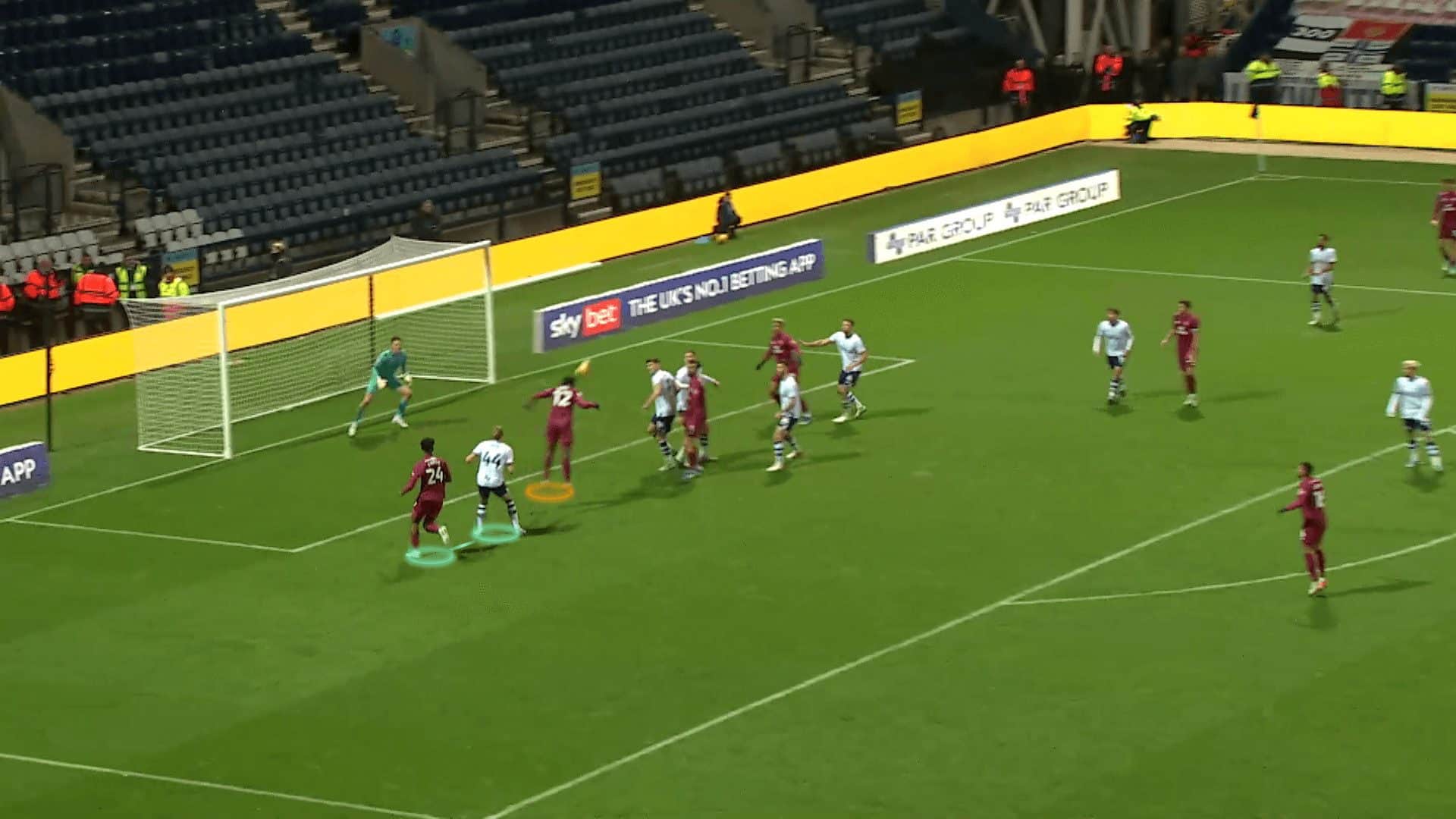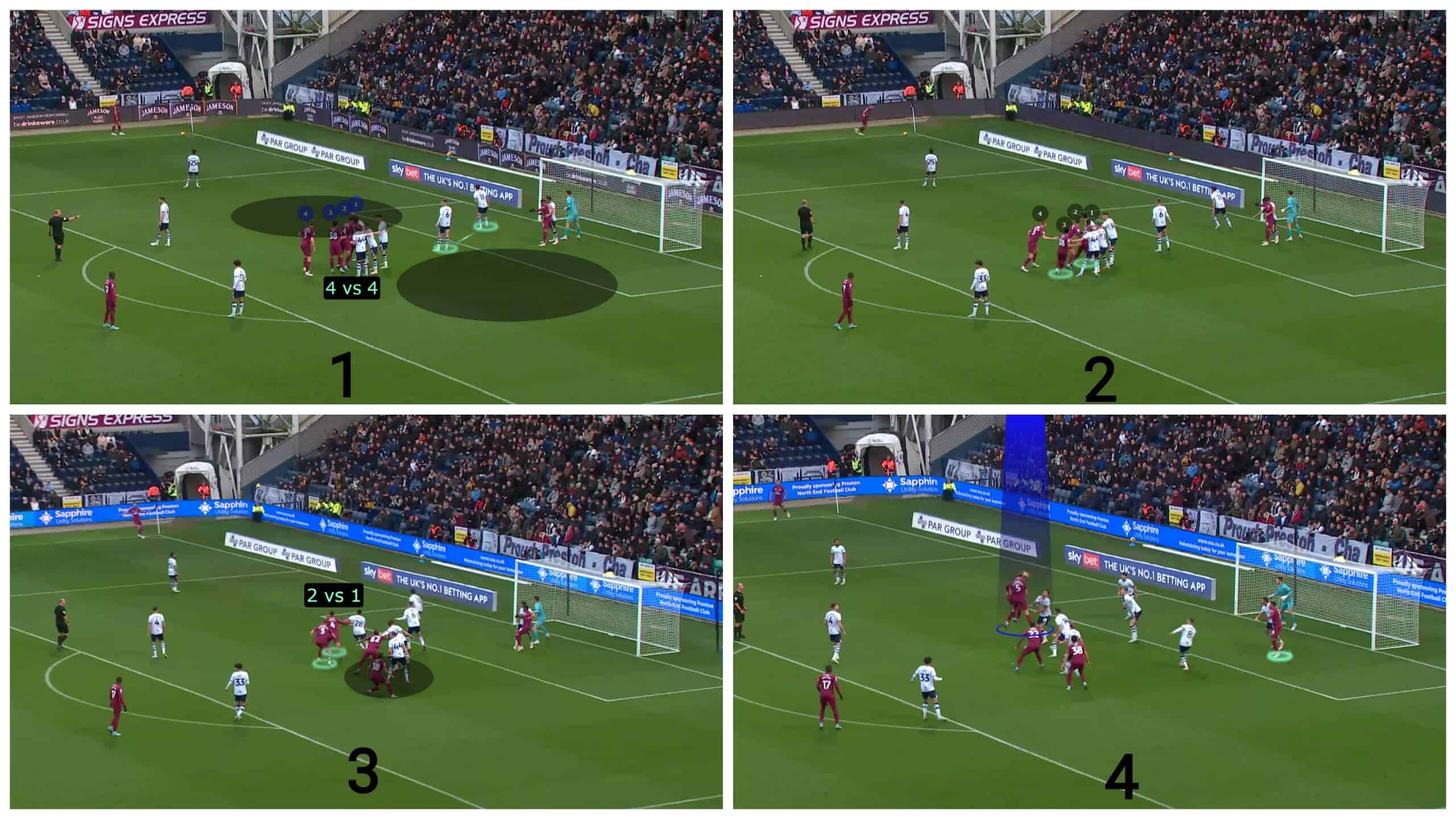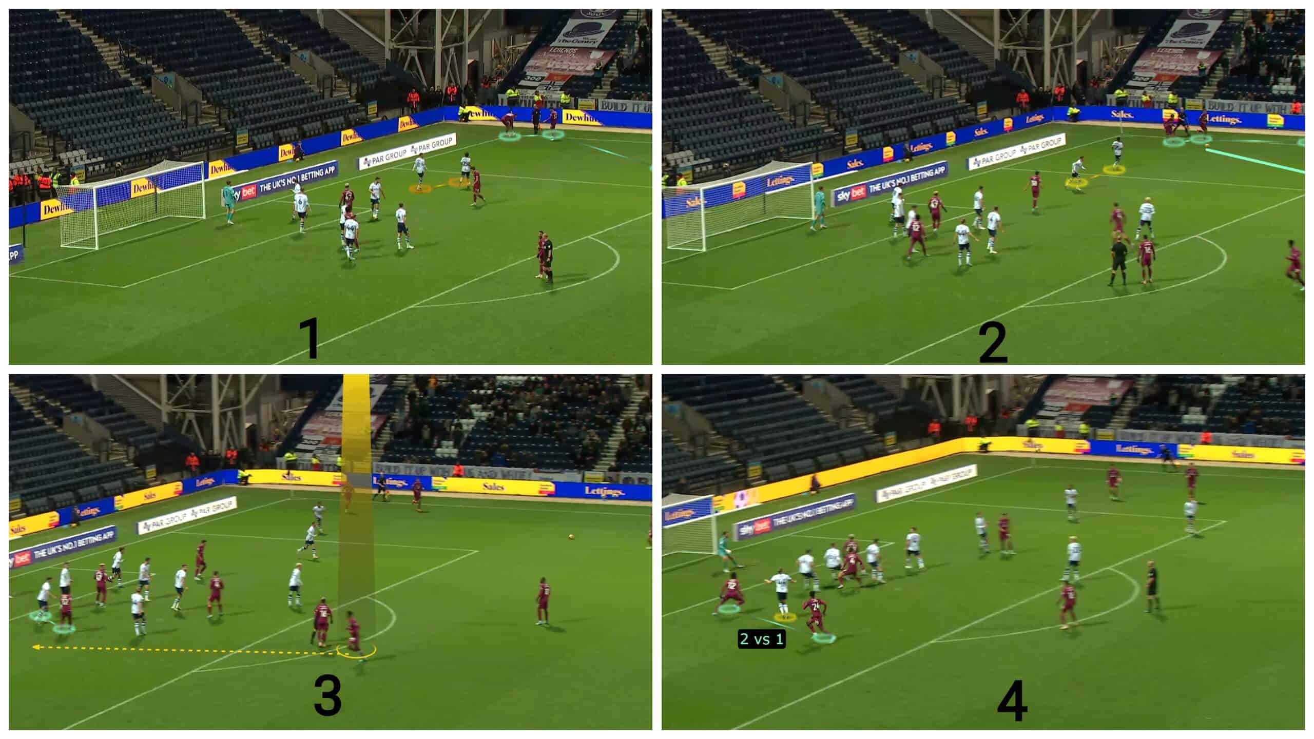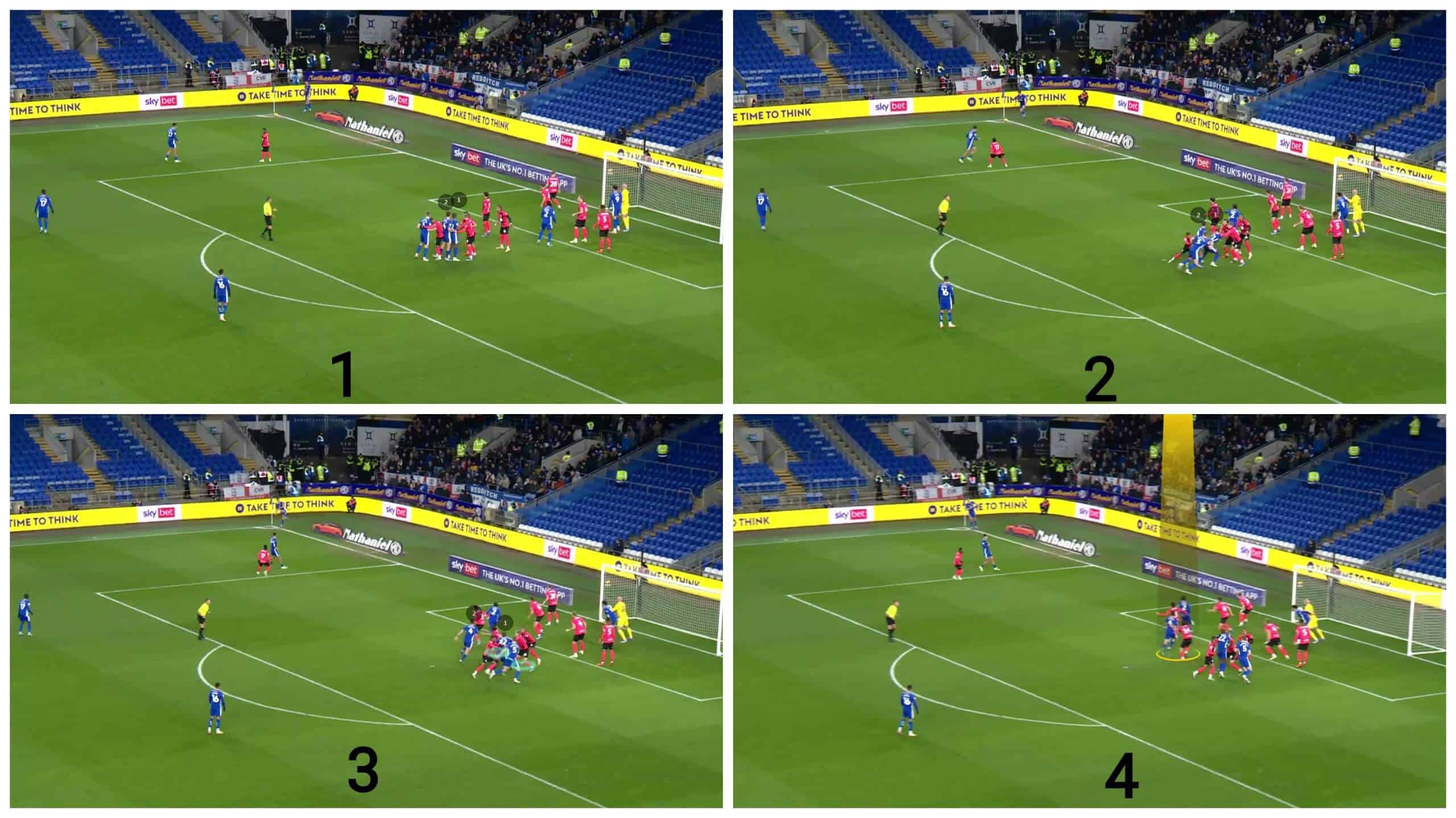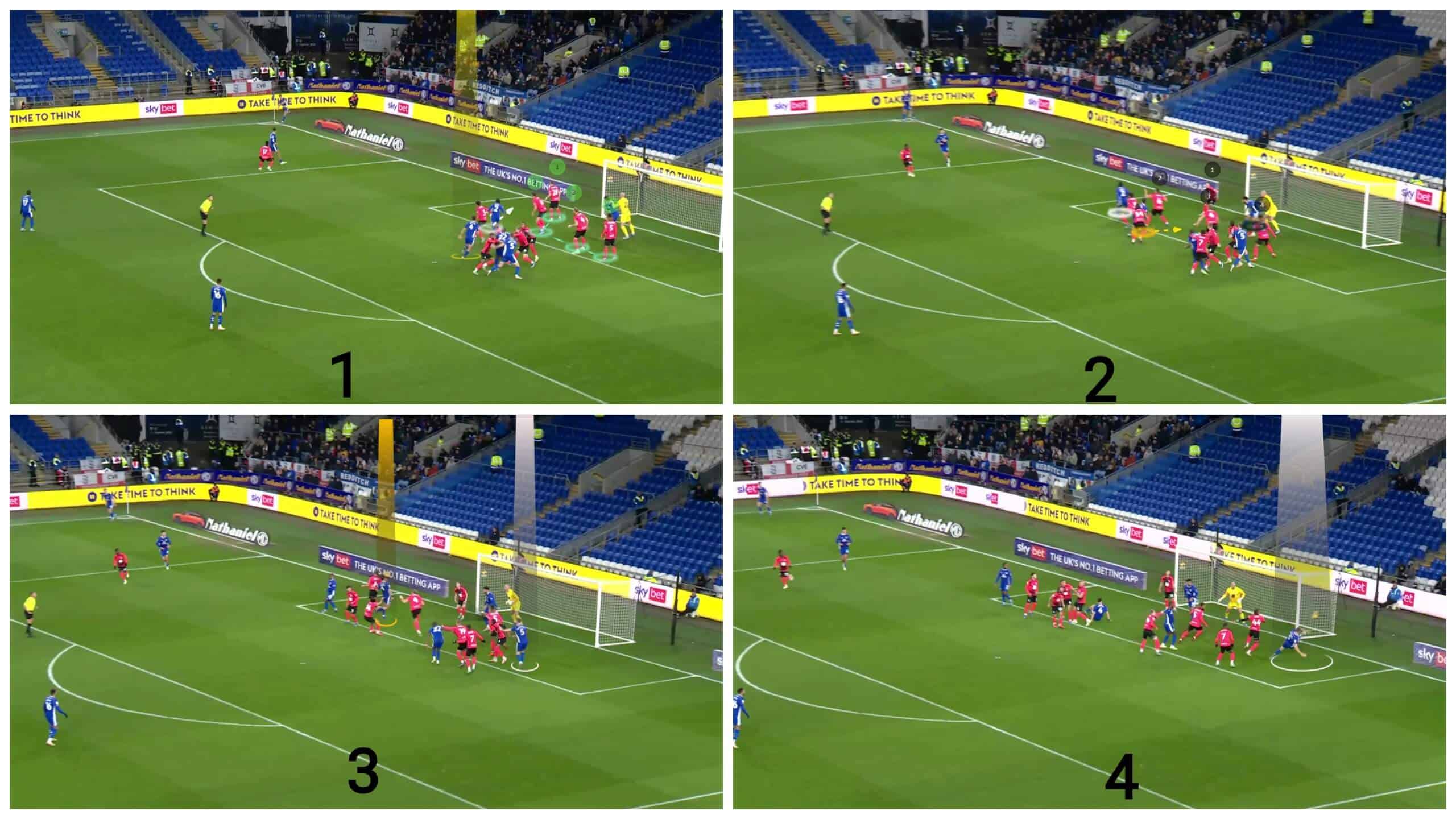 It is not only the numerical superiority and the dynamic mismatch that gives Cardiff City the superiority because of using stacks, but stacks can also cause an orientation problem for the defenders, as in the case below.