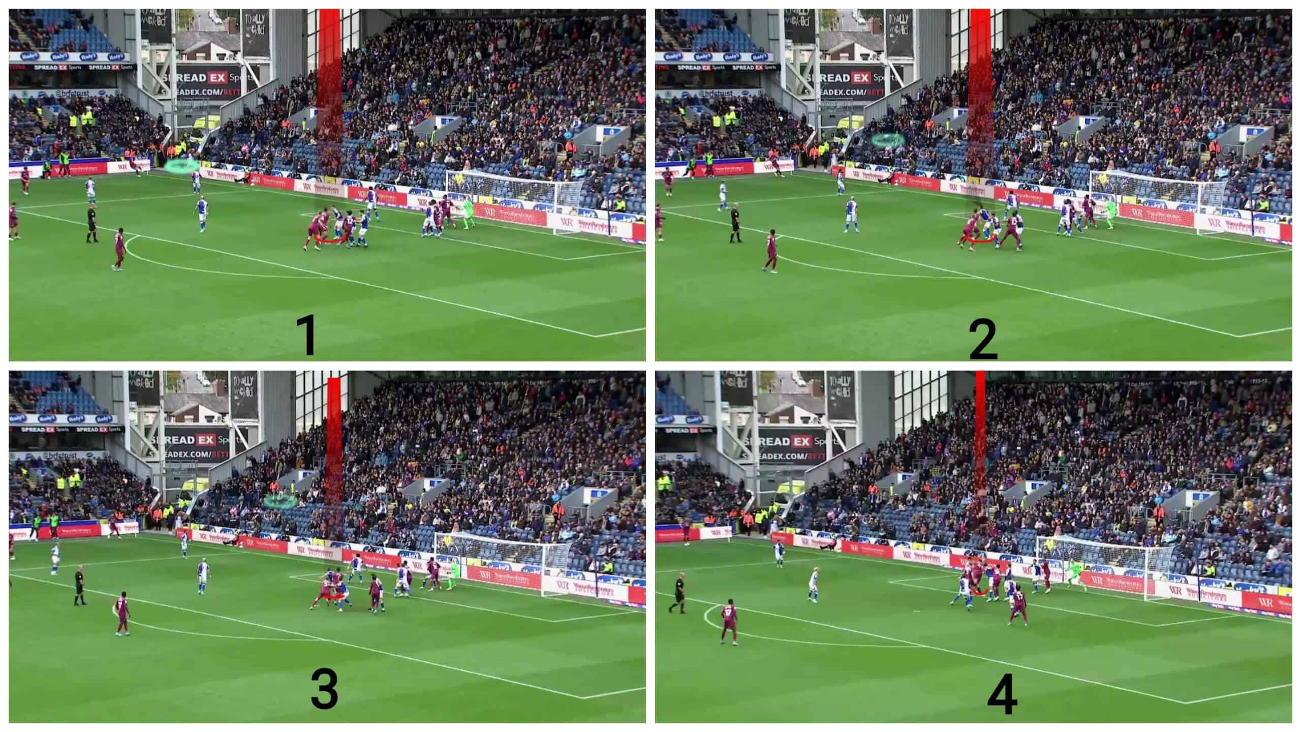 Using stacks doesn’t always lead to freeing a man or achieving numerical superiority. Still, it is also used to give your excellent attacker a chance to show his abilities in aerial duels by giving him only a second before his marker without physical touch, which annoys him to provide him with the time to run and jump, as in the case below.