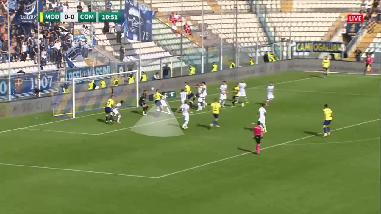 The Modena attacker has time to move into the optimal position to attack the ball, whilst the Como defender is busy turning back to face the ball again, and by the time they can track the flight off the ball, it is already too late. The Modena forward can jump early to attack the ball, which prevents any Como defender from being able to fight for the ball by the time they get in the correct position.
