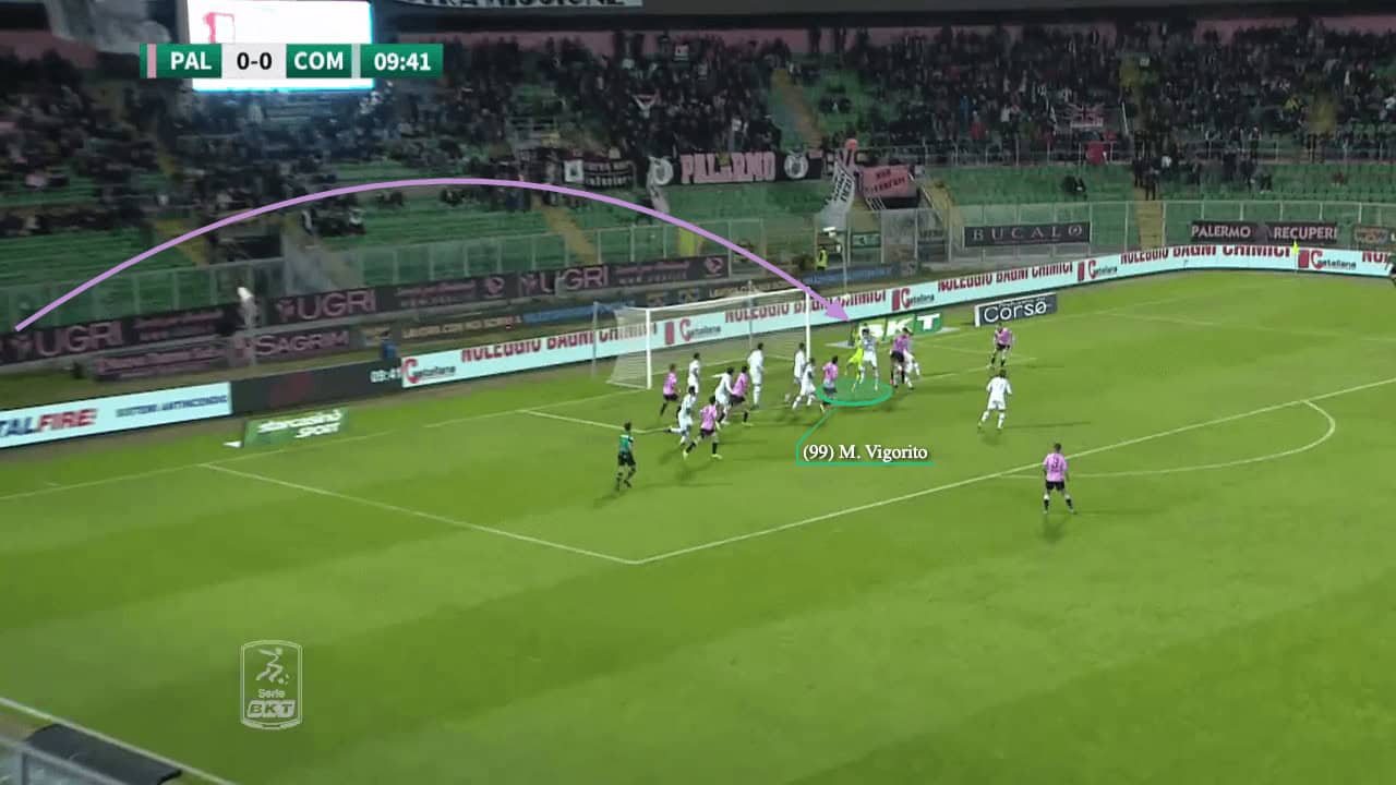 Another issue Como have faced in the first half of the season is poor sweeping from goalkeepers when attempting to claim crosses. Vigorito and Ghidotti have both faced issues when coming out to claim crosses this season. Below, we can see the keeper coming out attempting to claim the cross. However, he has fumbled the ball on a number of occasions, likely as a result of his inability to deal with contact.