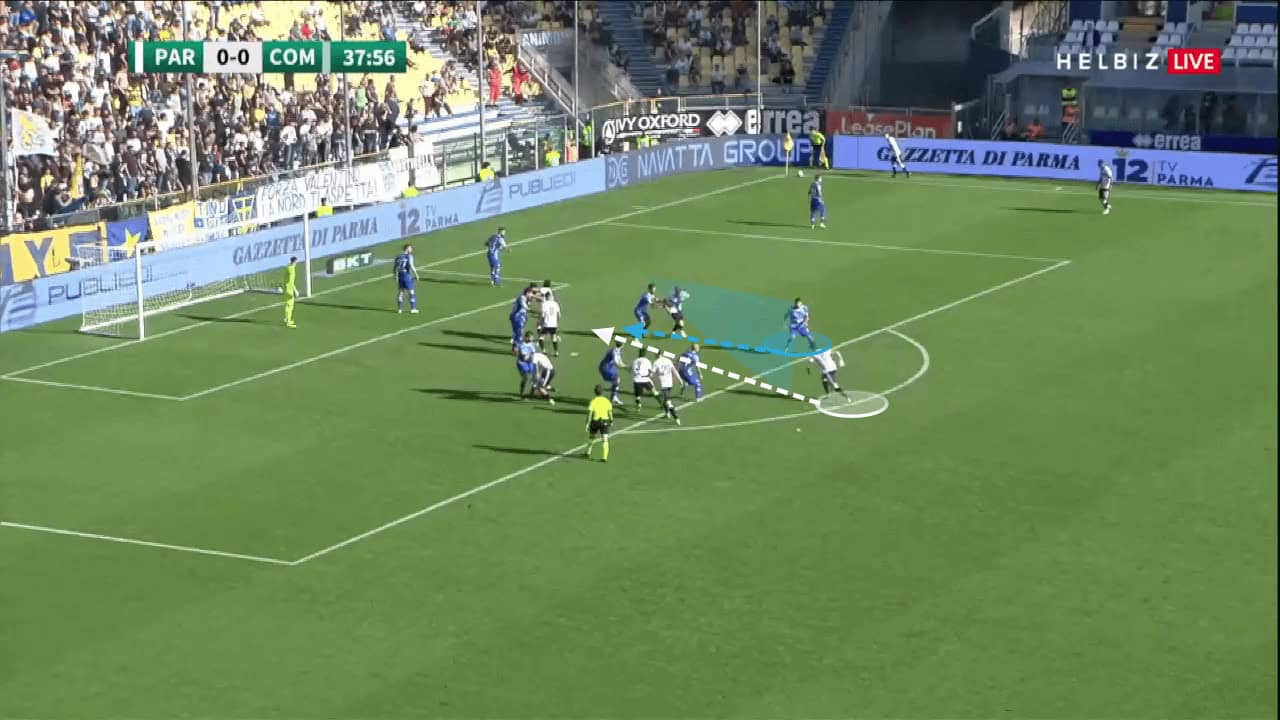 Parma’s attacker highlighted in white starts off very deep, acting uninterested in the first phase of the corner, leading the Como players to believe he isn’t a threat. However, he makes a late charge into the box, after the Como defender in blue falls into a false sense of security and wanders away from the box. By the time he realises the attacker is making the run, he is too far from the Parma player to affect his run, and later on, cannot win the aerial duel as he is focused on the location of the player instead of the ball.