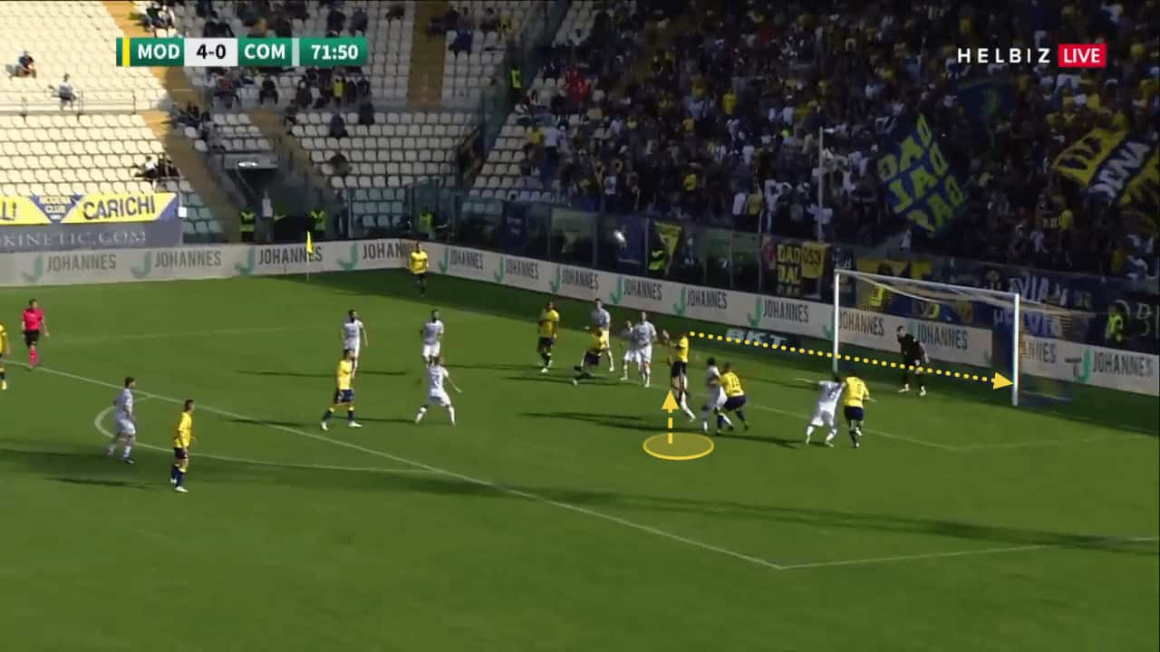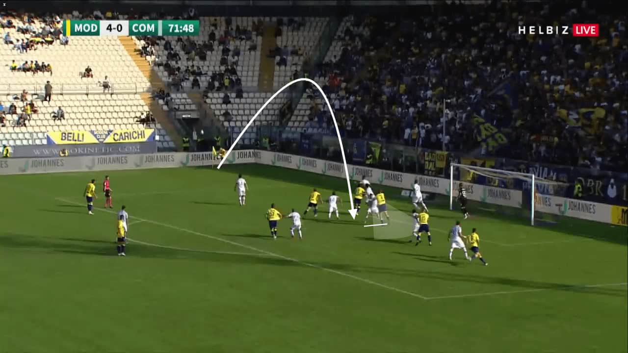Como’s players have a habit of getting in the wrong positions when man-marking, leading to them becoming unaware of the trajectory of the crosses coming in. Picture below, we see yet again, a Como defender failing to get goal side of their marker. The Modena attacker managed to create separation through a body feint, allowing him a clear path to attack the goal. The Como defender is set on closely following his marker, which leads to him turning his back on the ball as the corner kick is being taken.