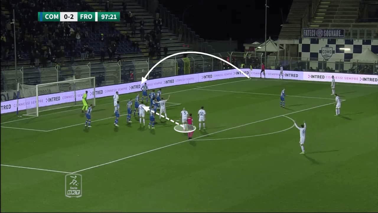 The example below illustrates the free run the Frosinone player is about to have to attack the ball. He is slightly crouched down, ready to spring into life when the corner gets taken. When the ball arrives at the six-yard box, the Frosinone is able to outjump the entire Como zonal block and attempt a free header on goal.