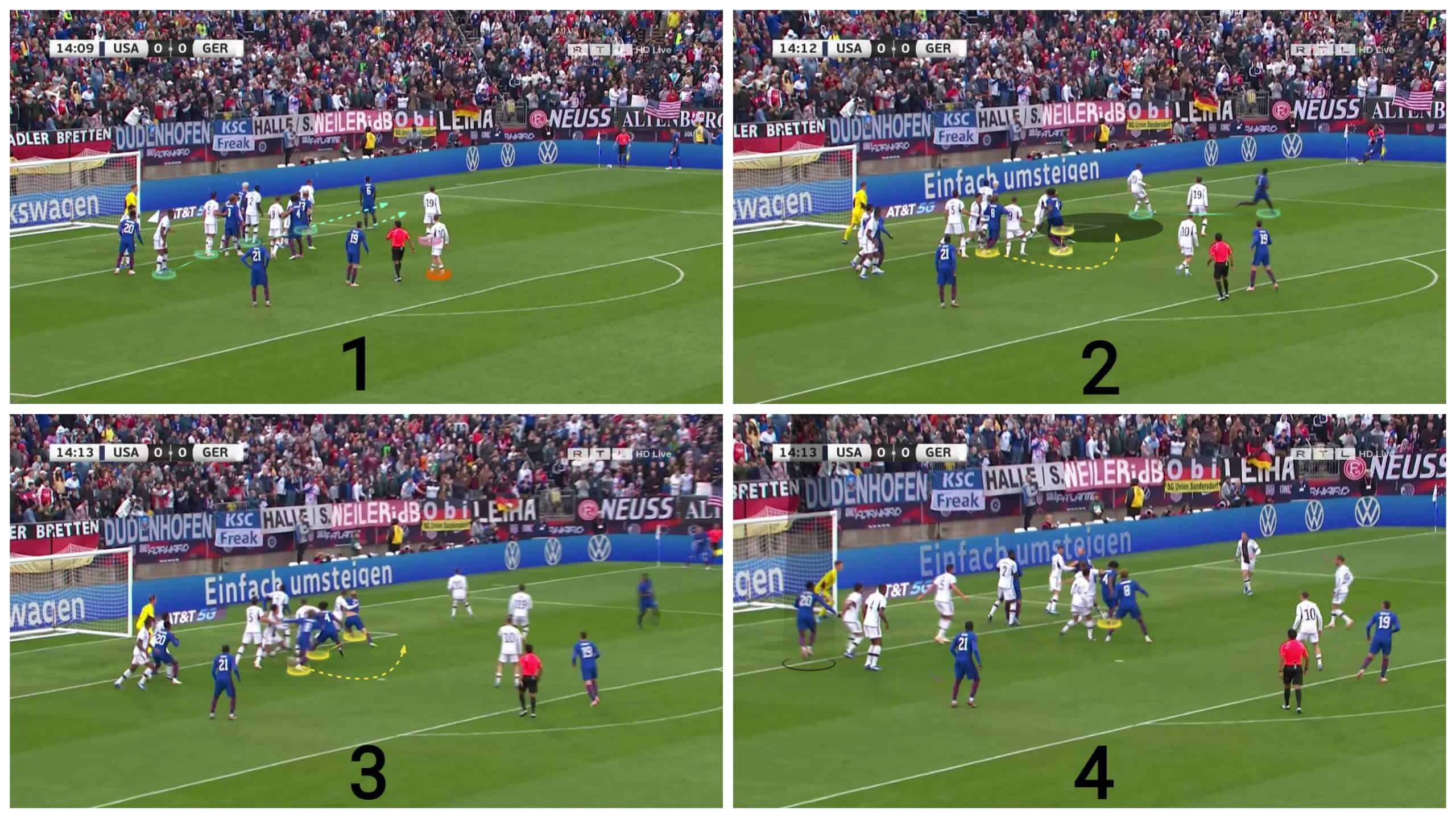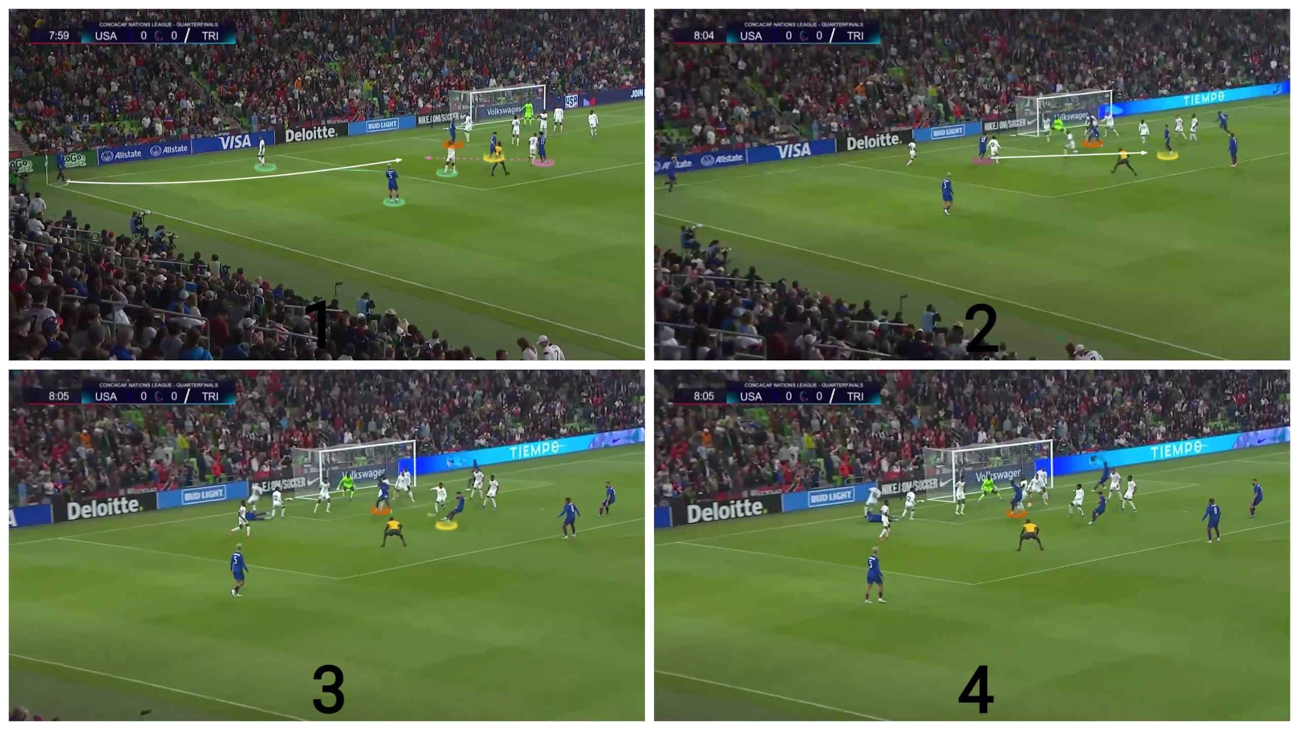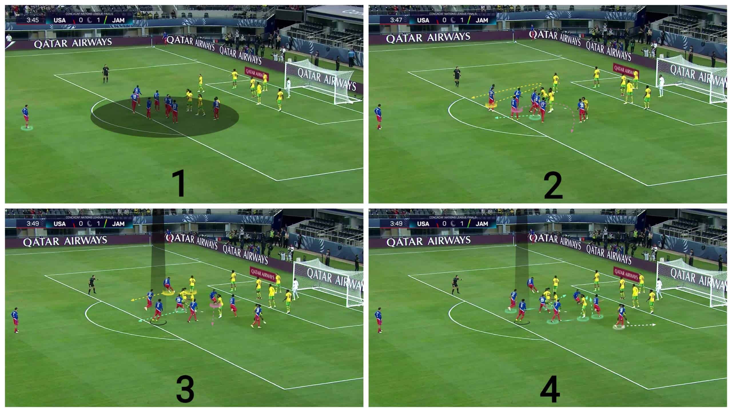 In the second photo, USA asks the green attacker to move next to the first zonal defender, acting like he wants to win the first touch in the area before the near post. Meanwhile, the pink attacker moves toward the short area, making sure that the short-option defender won’t come back to defend this area, which will make the first zonal defender stay in his position.