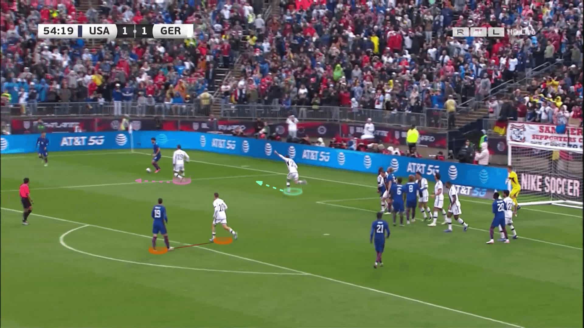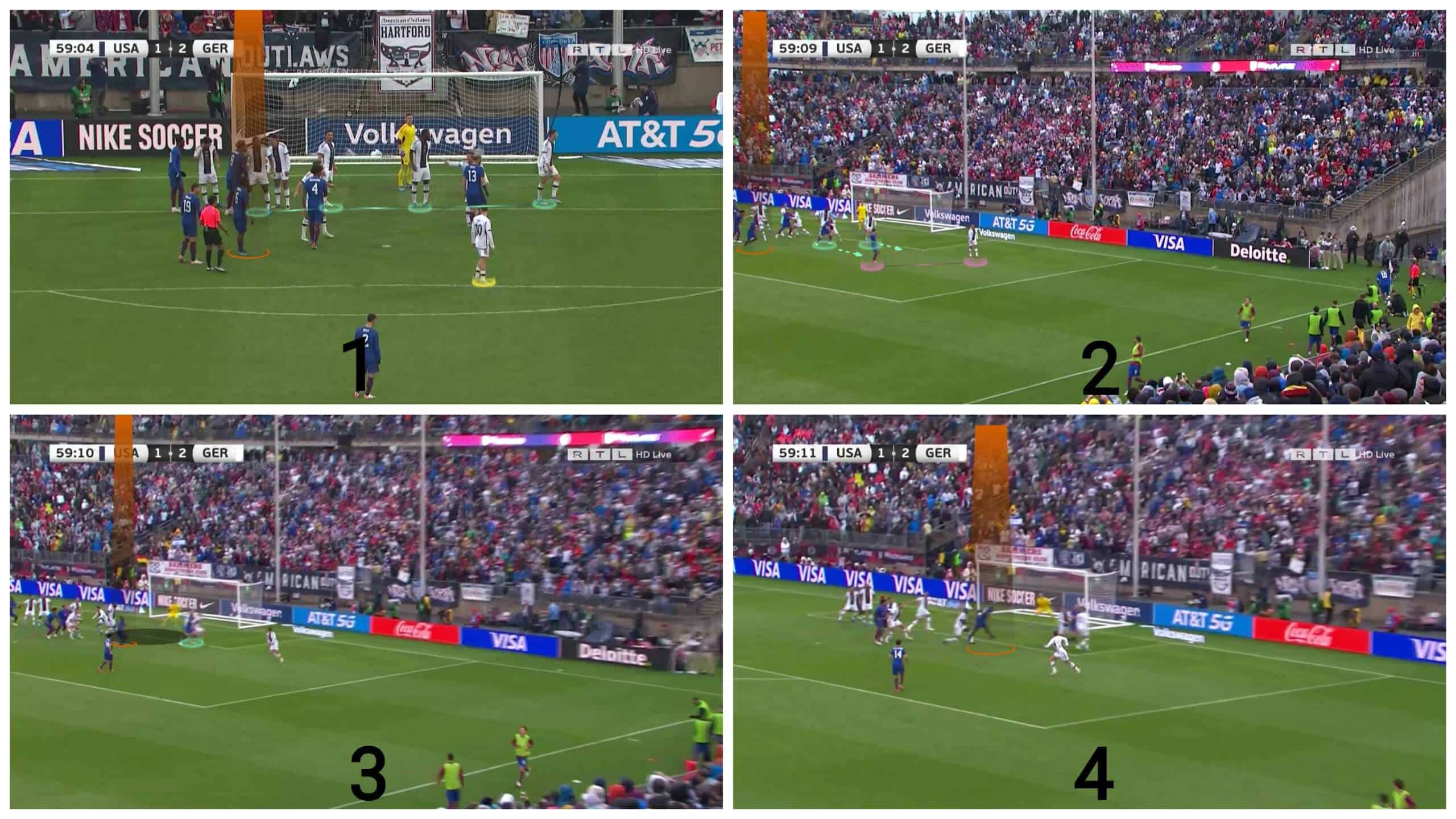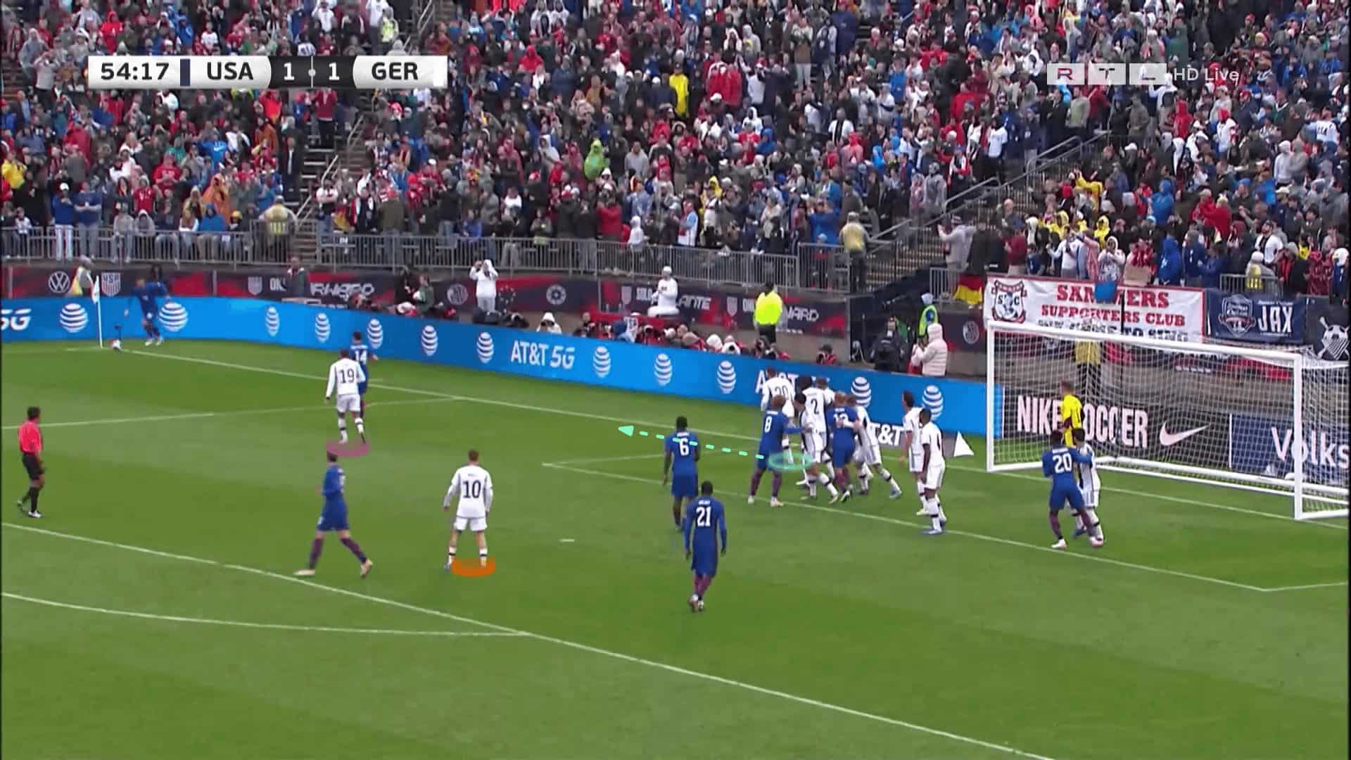 In the second photo, USA asks the green attacker to move next to the first zonal defender, acting like he wants to win the first touch in the area before the near post. Meanwhile, the pink attacker moves toward the short area, making sure that the short-option defender won’t come back to defend this area, which will make the first zonal defender stay in his position.