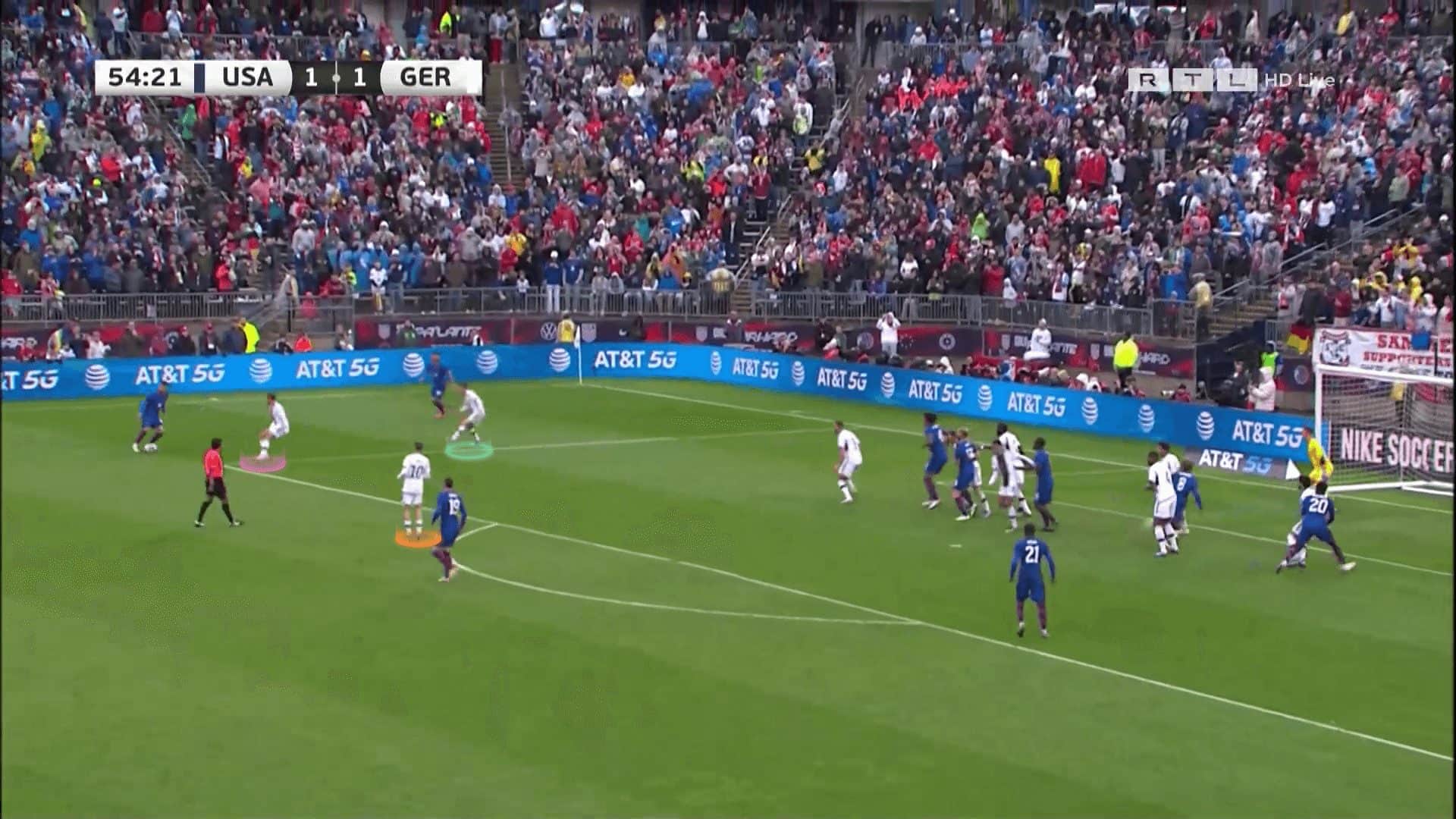 They also showed a good possibility to implement routines exploiting the shifting of one member of the zonal line making the distance between him and his mate bigger, especially against teams who put the zonal line aligned to the goalmouth and don’t put an additional defender in front of them to defend flicks at the area in front of the near post, as shown in the first photo below in which  Germany defend with four zonal defenders, four man markers, a short-option defender and a rebound defender. USA have six attackers inside the box meaning that there are two free attackers inside the box, the orange one is the targeted player.