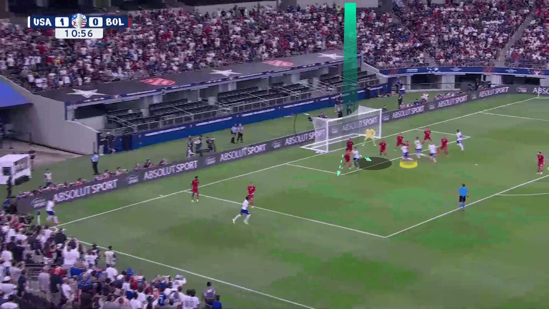 Starting with the first corner against Bolivia, which ended with a goal, Bolivia defended with five zonal defenders, three-man markers, a short-option defender and a rebound defender, as shown in the photo below in which a short-option attacker goes quickly to receive a short touch from the taker, Christian Pulisic. In contrast, there are only three attackers near the zonal line, and the others are still walking slowly near the edge of the box, making the man markers wait for them, and we will explain why.