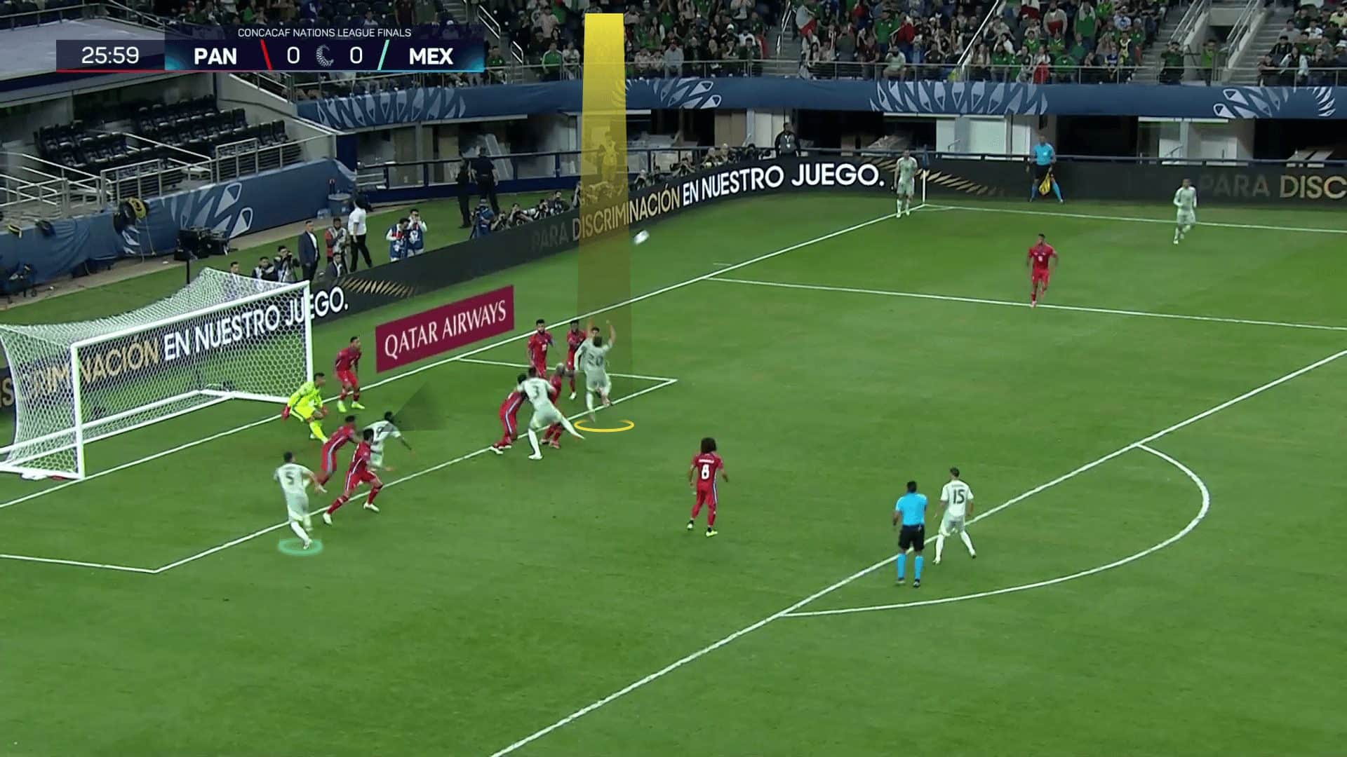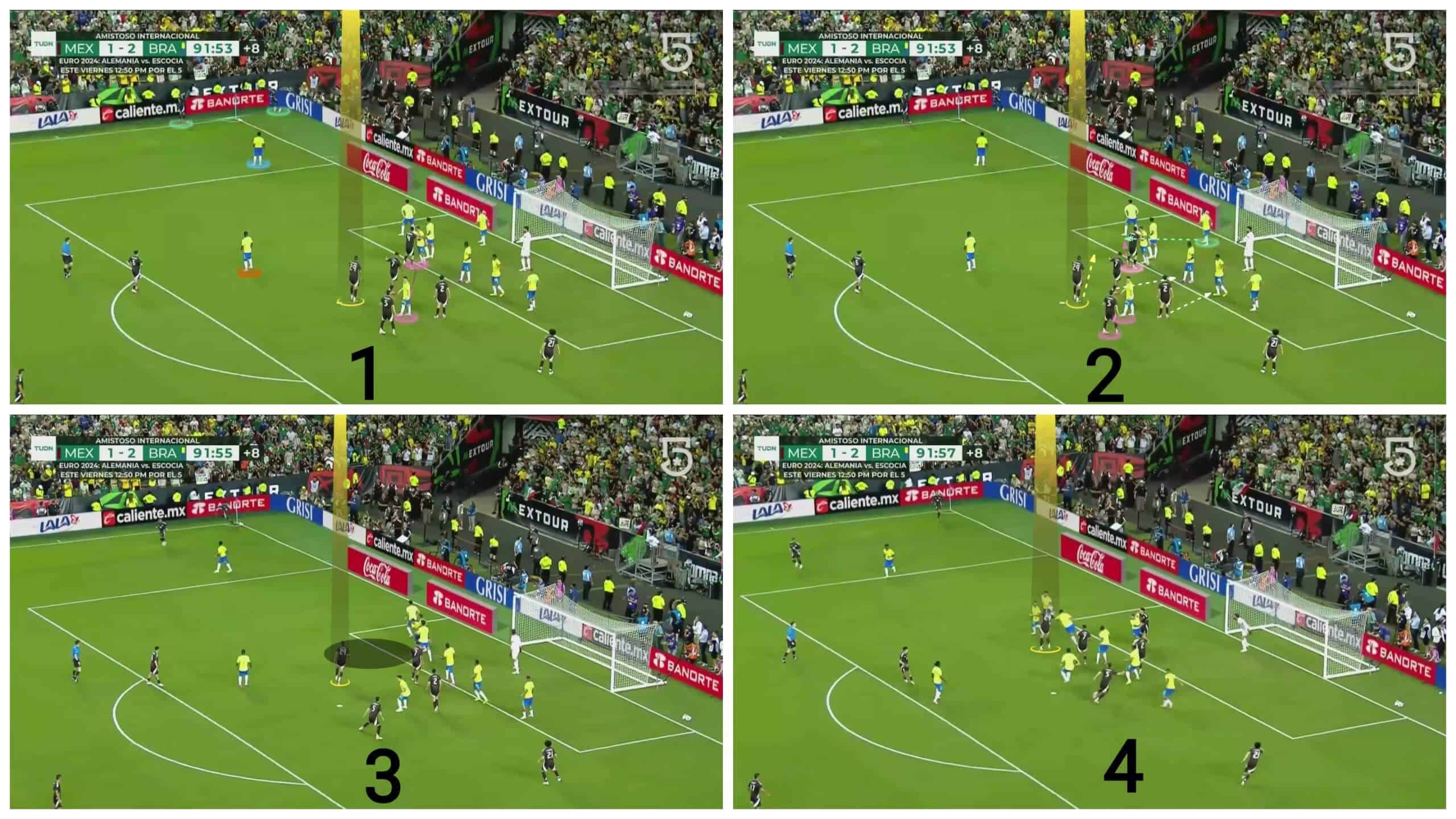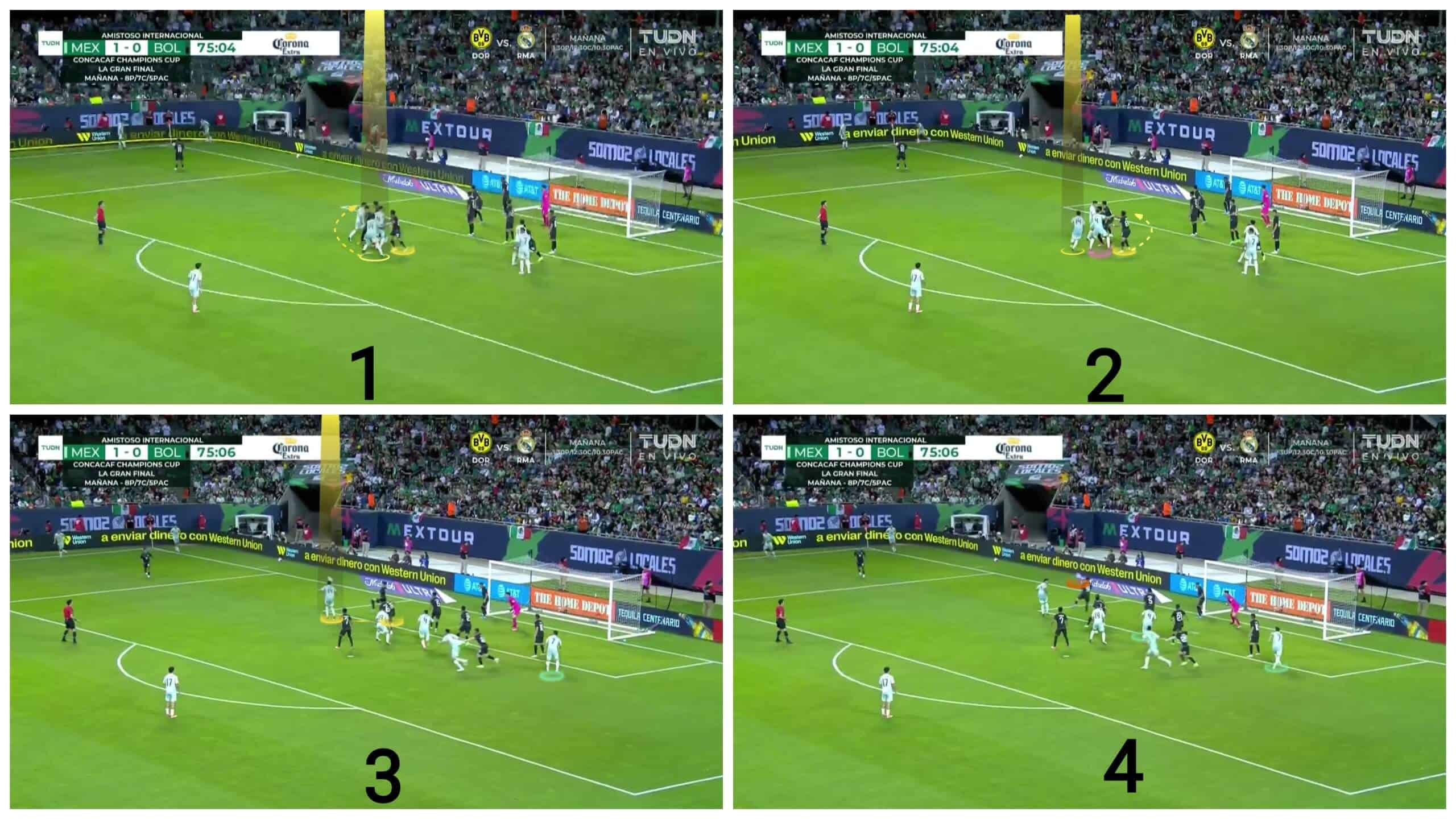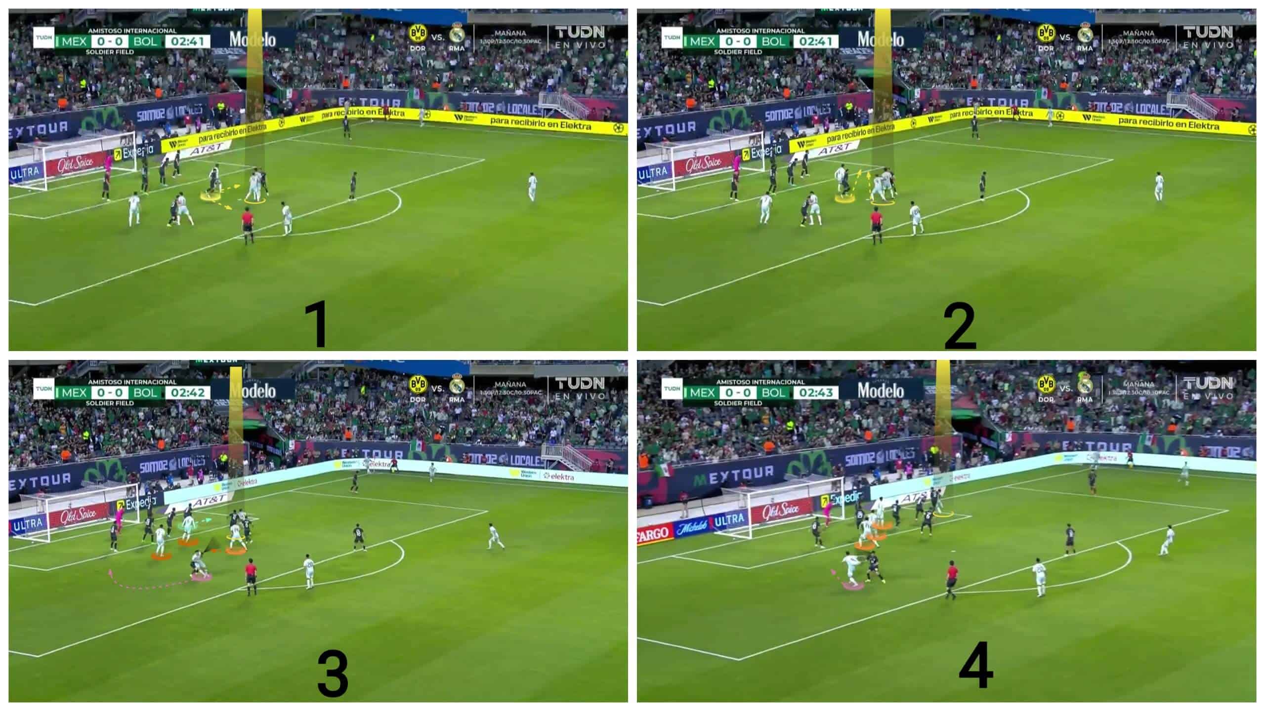 So Mexico uses a short option attacker in the first photo below to ensure that there are only two man markers against their attackers. They target a free one, in yellow. Thus, the first part of the plan is already done by using numerical superiority against man markers, but let’s go to the second photo to learn the second part, which is making sure that a zonal defender won’t occupy the targeted zone.