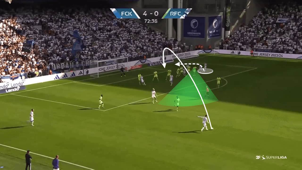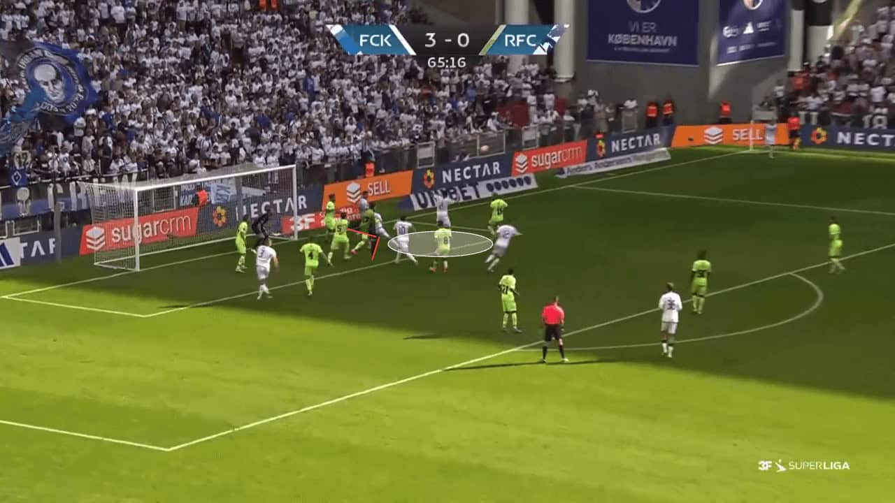 Below we can see another example of when København were able to outnumber the defensive unit around the penalty spot. The free player can be seen arriving at the six-yard box, where no defender is close to challenging for the ball.