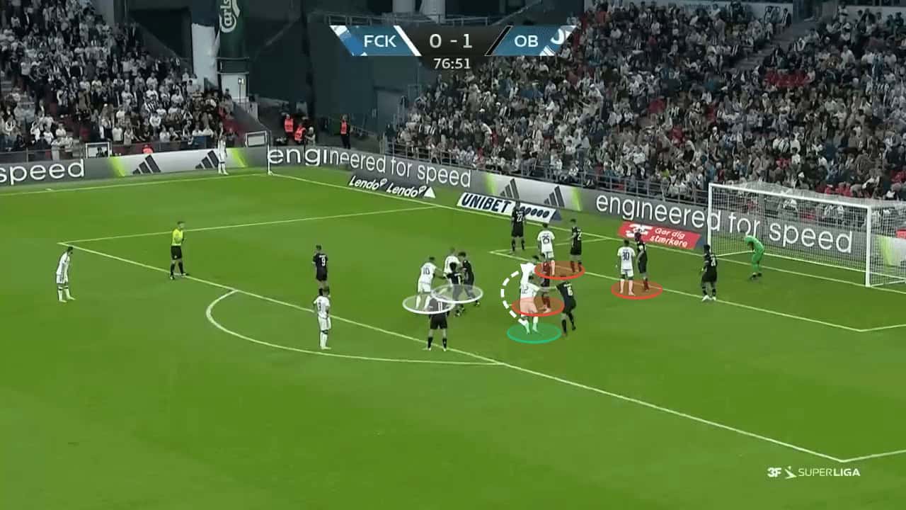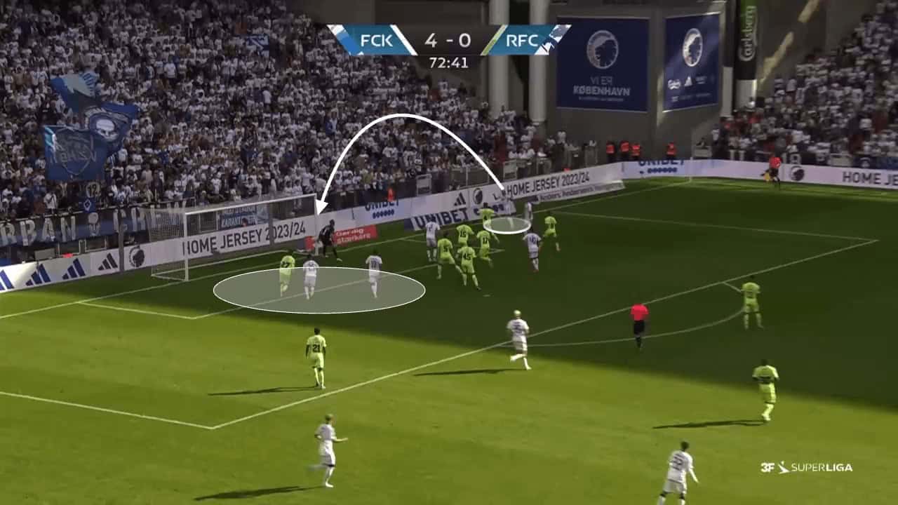 København can build on this further by increasing the chaos for defenders by potentially adding even more screens, decoy movements, or changing starting positions in order to provide the deeper attacking unit with added opportunities to lose their marker during their attempts to attack the six-yard box which is now easily accessible for the reasons stated earlier in the article.