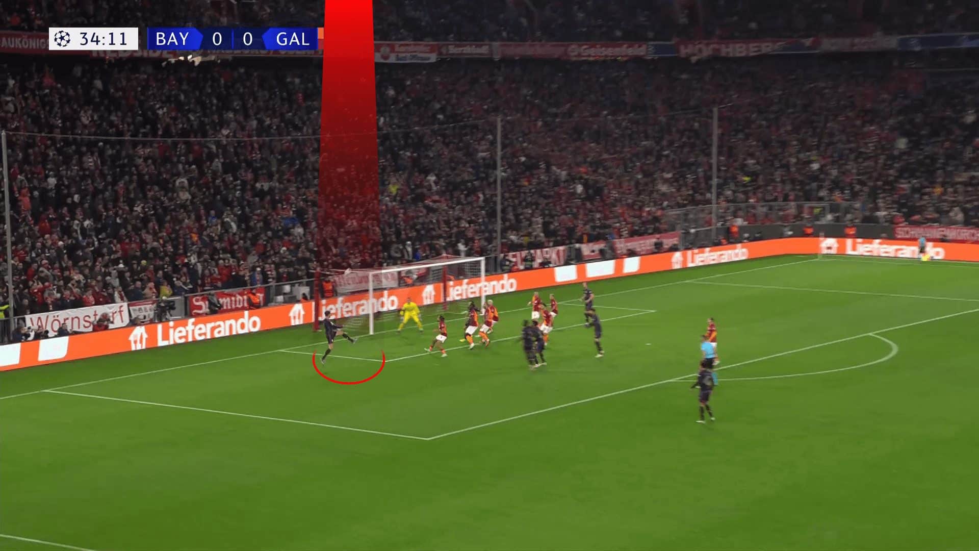 Bayern Munich prefer to target the area behind the last player of the defending line by blocking him from another player to free the space for the targeted player who comes from a farther distance with his pace, having the time to target this area while the ball is in the air and this is the reason for targeting the far post in these routines besides being away from the goalkeeper who can’t go to pick the ball, as we will show in the following case.