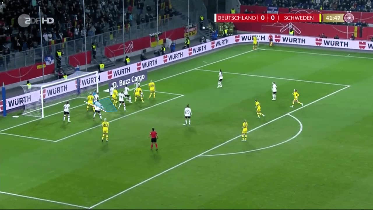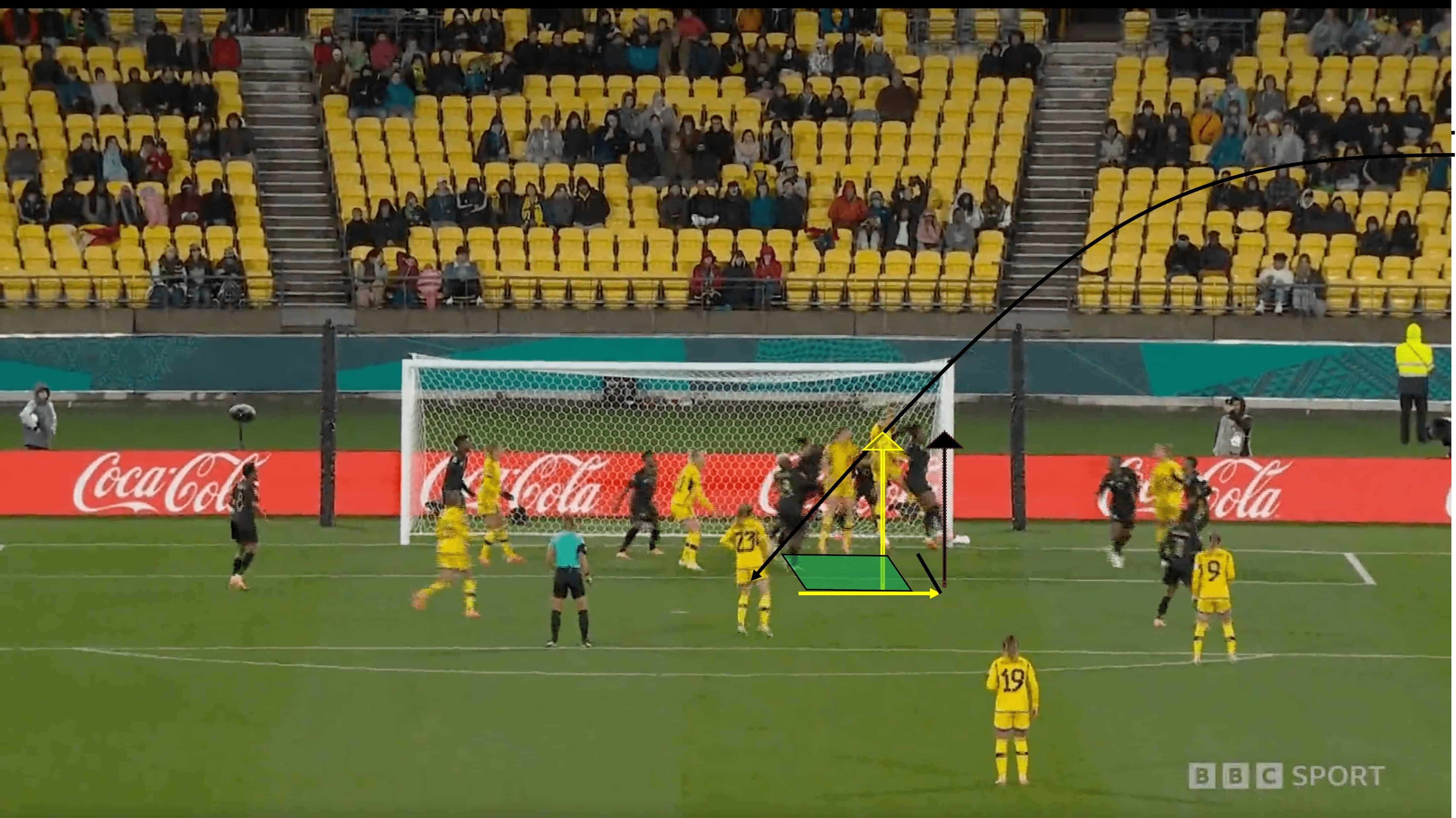 We can then see this in action, with the attacker being able to meet the ball at her peak jump height, whilst the defender has also attempted to clear the cross but was unable to meet it. This has been Sweden’s key to achieving success from these corners.