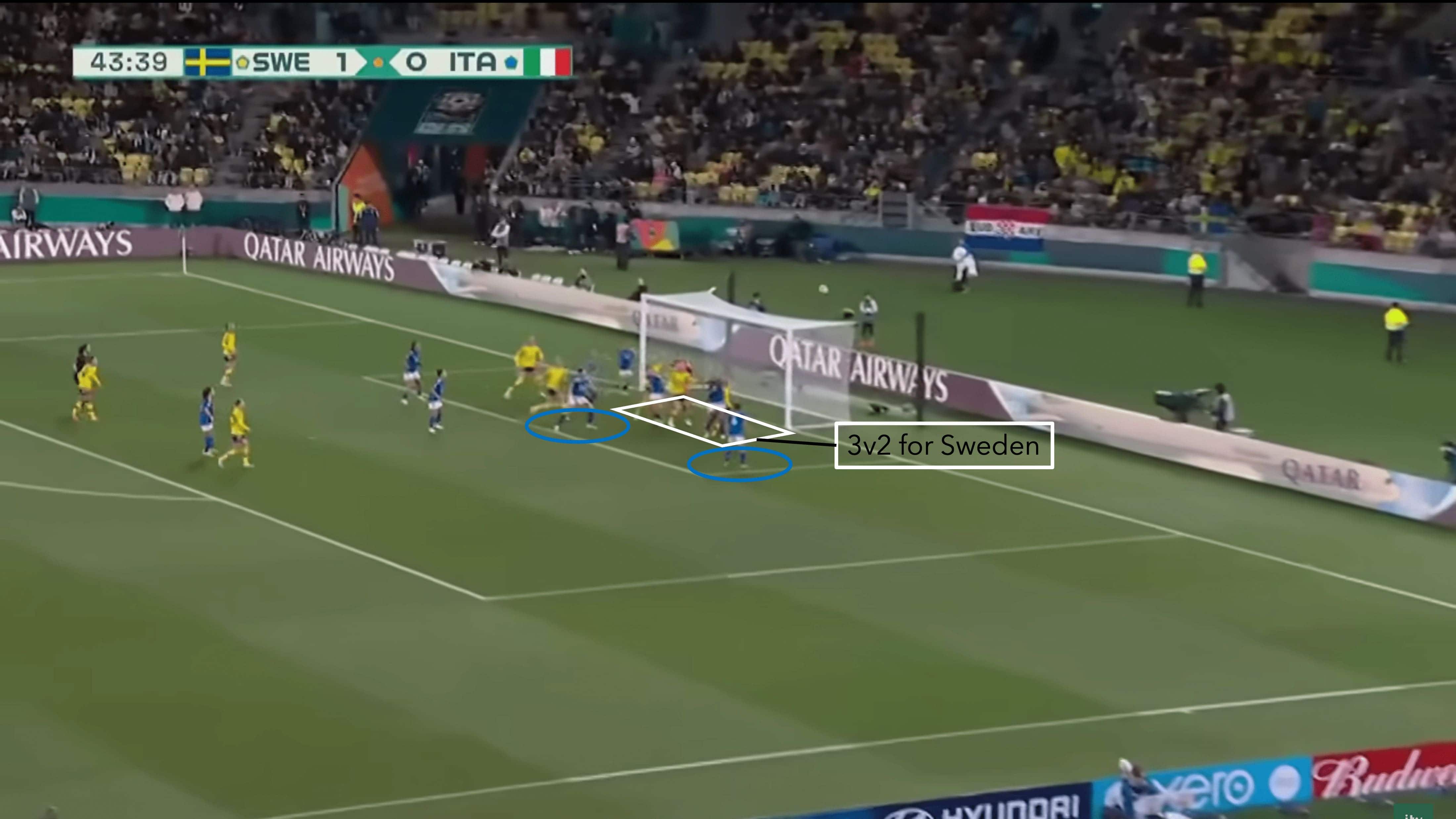 As a result, the roles can be reversed, and we can see a defender making a screen on the Swedish attacker to block them from being able to mark the goalkeeper. This then allows the goalkeeper to step off her line and attack the floated cross inside the six-yard box.