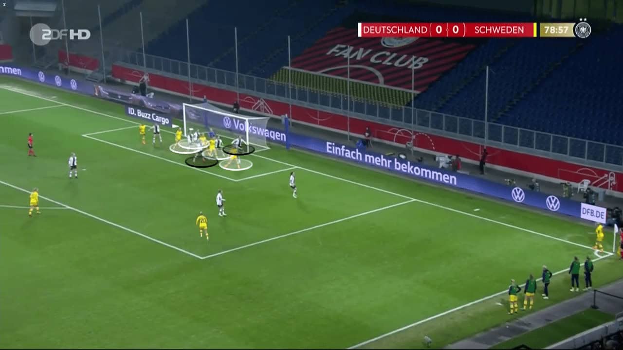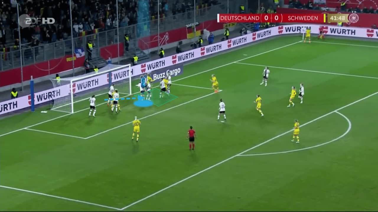 The target player, Illestedt, has time to move directly behind her marker. From that position, she is able to edge forwards slowly toward the corner taker, forcing her marker to move in the same direction, further away from the target area. Although these movements can seem minimal and sometimes are barely visible, they make a massive difference, especially inside the six-yard box.