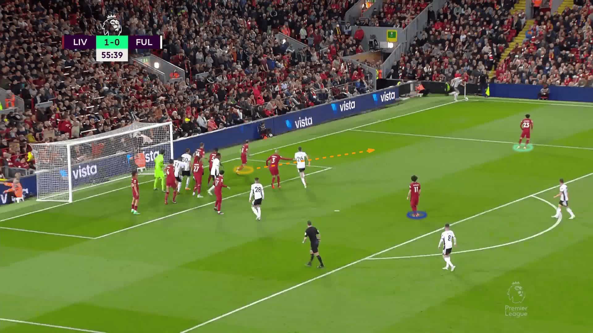 As shown below, Liverpool defends the short corner with the green player. The yellow zonal player, whose first responsibility is to get the first touch in crosses, especially flicks, is ready to help him after playing the short corner to prevent a 2v1 situation. The blue player is in the rebound zone, so we have three players prepared to defend this area.