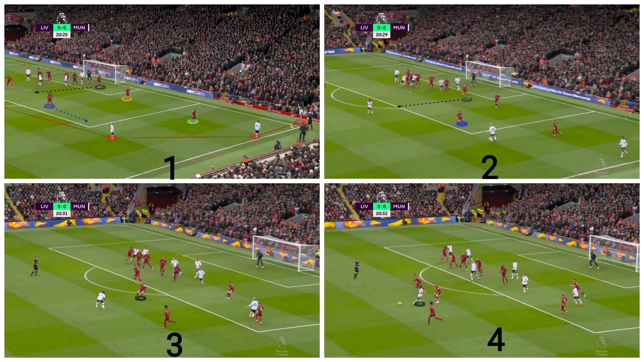 Liverpool could easily face a new challenge with four attacking players in this area. In the first photo, the four attacking players are highlighted in red using two attacking short options and a rebound player out of the shot. Liverpool, as usual, defend with a green player to defend the short option with the yellow zonal player who comes to help and the blue player on the rebound zone, so the situation is 4v3, but they have a plan which is making the rebound player, in blue, defend against the second short option while the near post player, in black, goes to defend the rebound zone. In the second photo, the rebound defender, in blue, faces the second short option, which gives the near post player in black time to meet the rebound-attacker, which forces him to pass the ball to the back, as shown in the third and fourth photos.