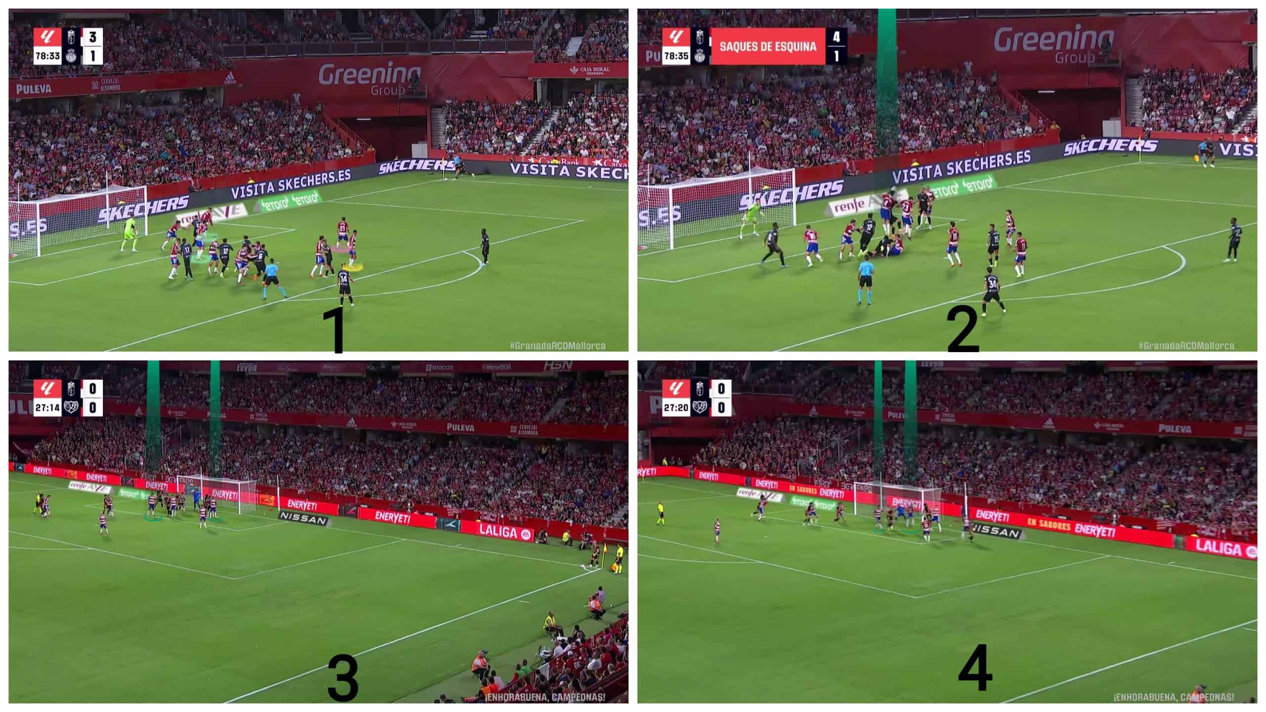 In this tactical analysis, we will delve into the defensive structure of Granada while defending against corner kicks, elucidating the weaknesses in their tactics that have led to such outcomes. Subsequently, we will discuss some suggestions aimed at potentially improving their performance in the future.