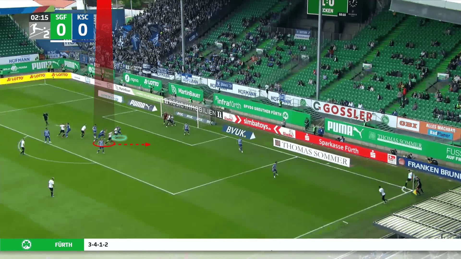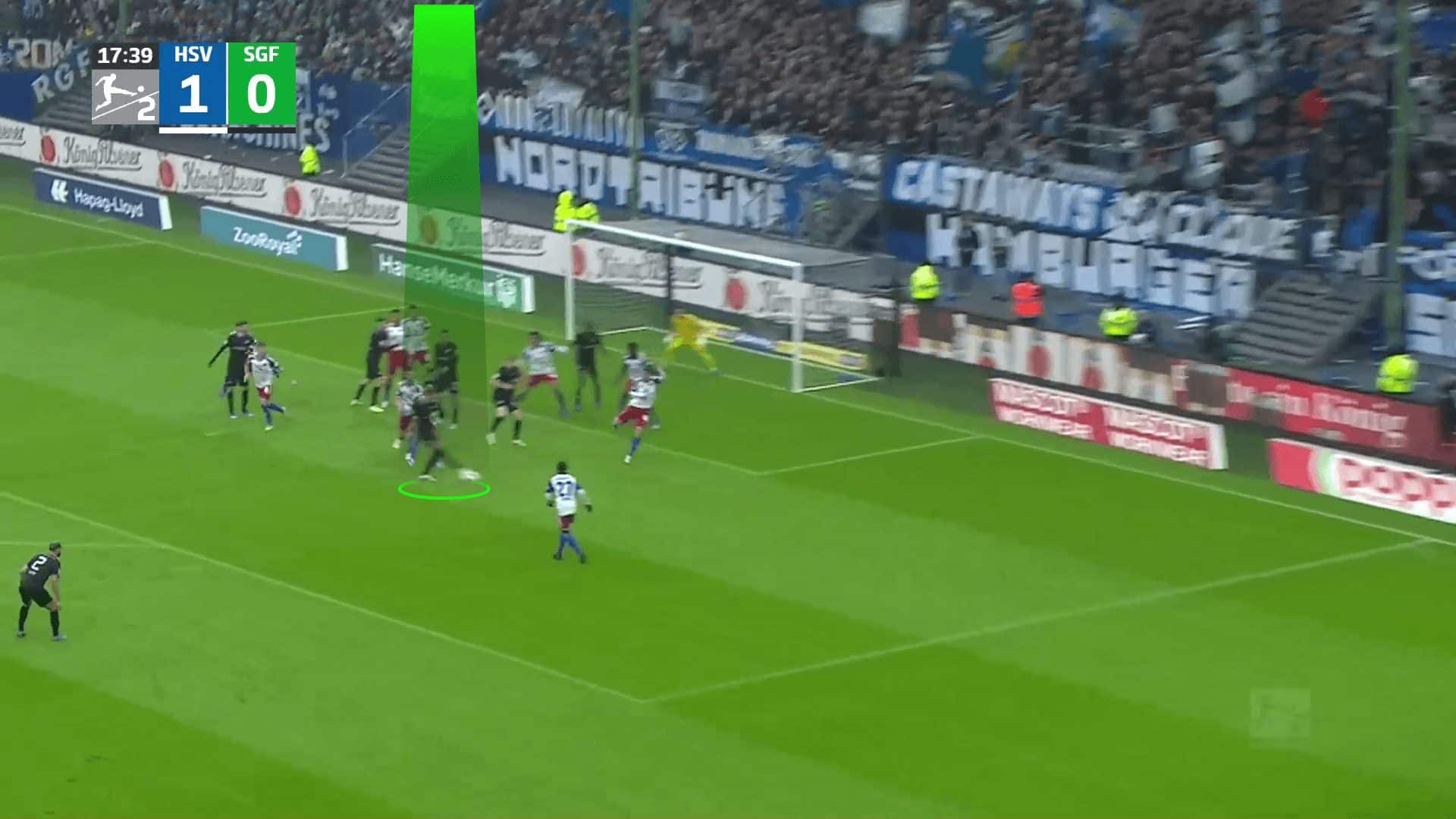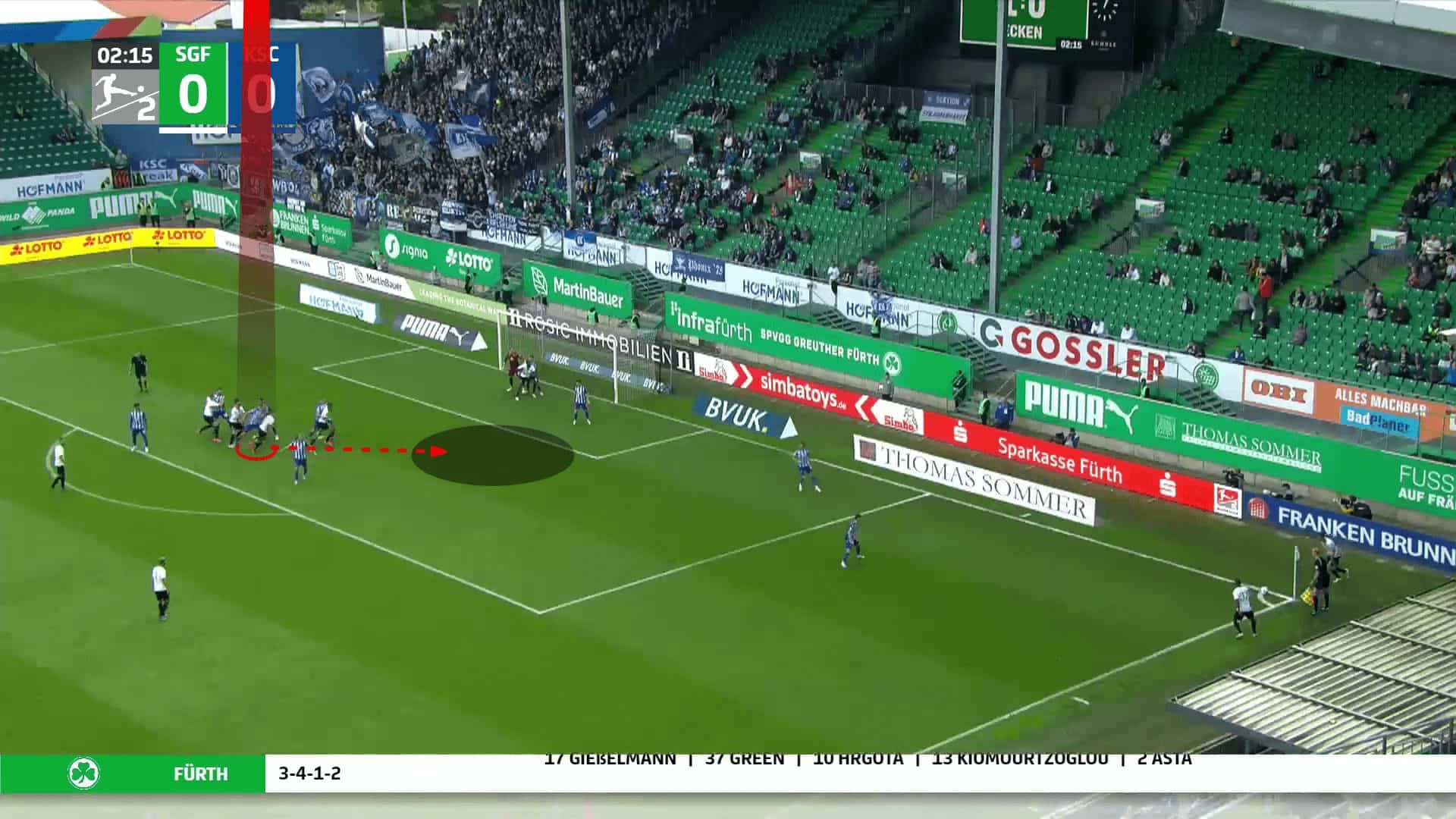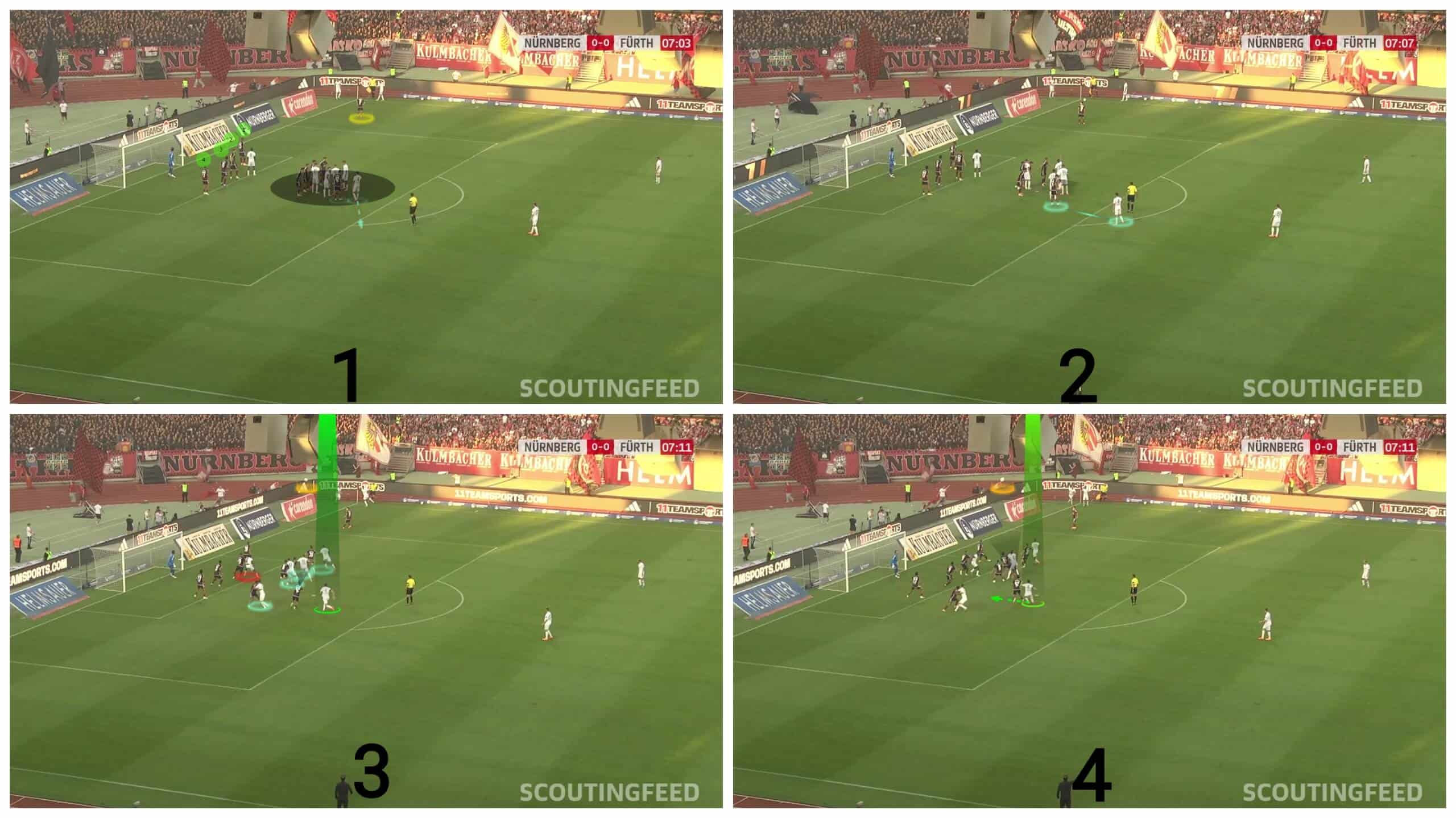 Going to an example to make the issue clear, the opponent defends with a man marking defending system with only two zonal players, two short-option defenders due to Greuther Fürth’s two takers and a rebound defender. In comparison, Greuther Fürth put a player on the near post to drag the two zonal players, a player on the far post, and four players in a stack, while the last one targeted the black area shown in the first photo.