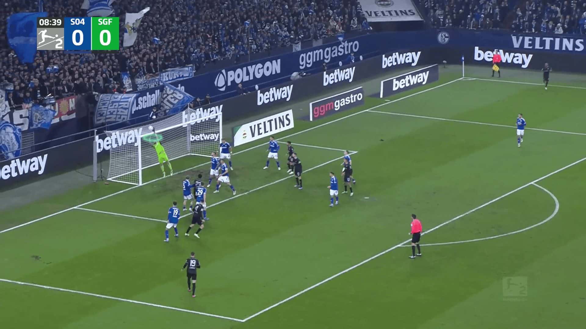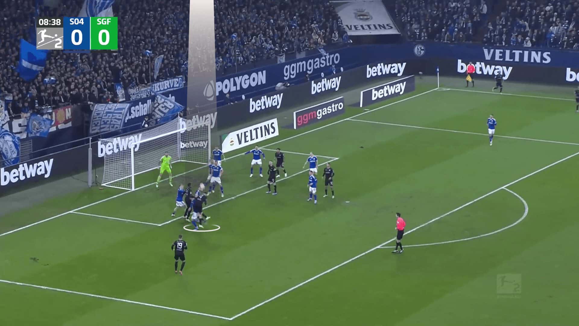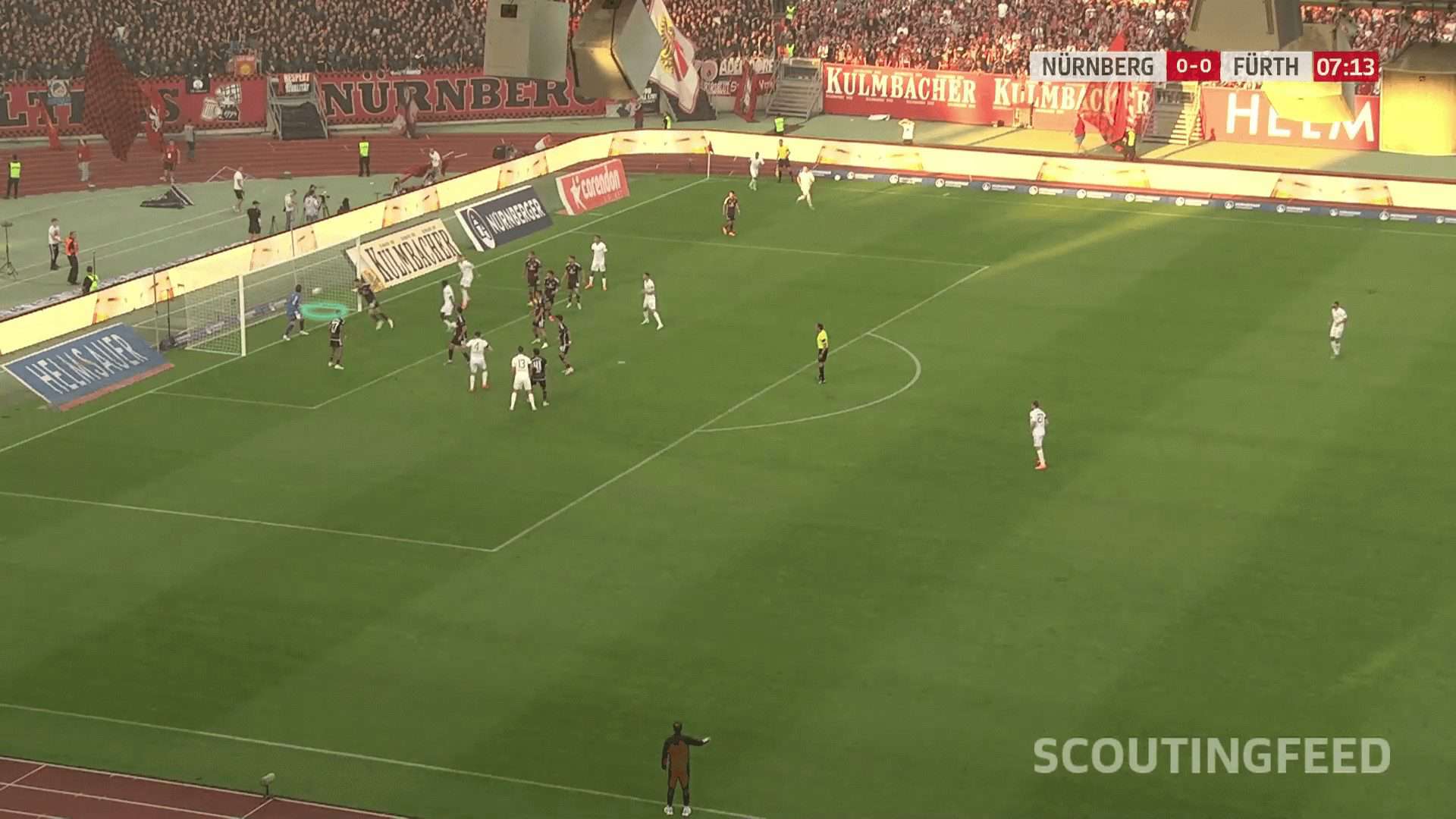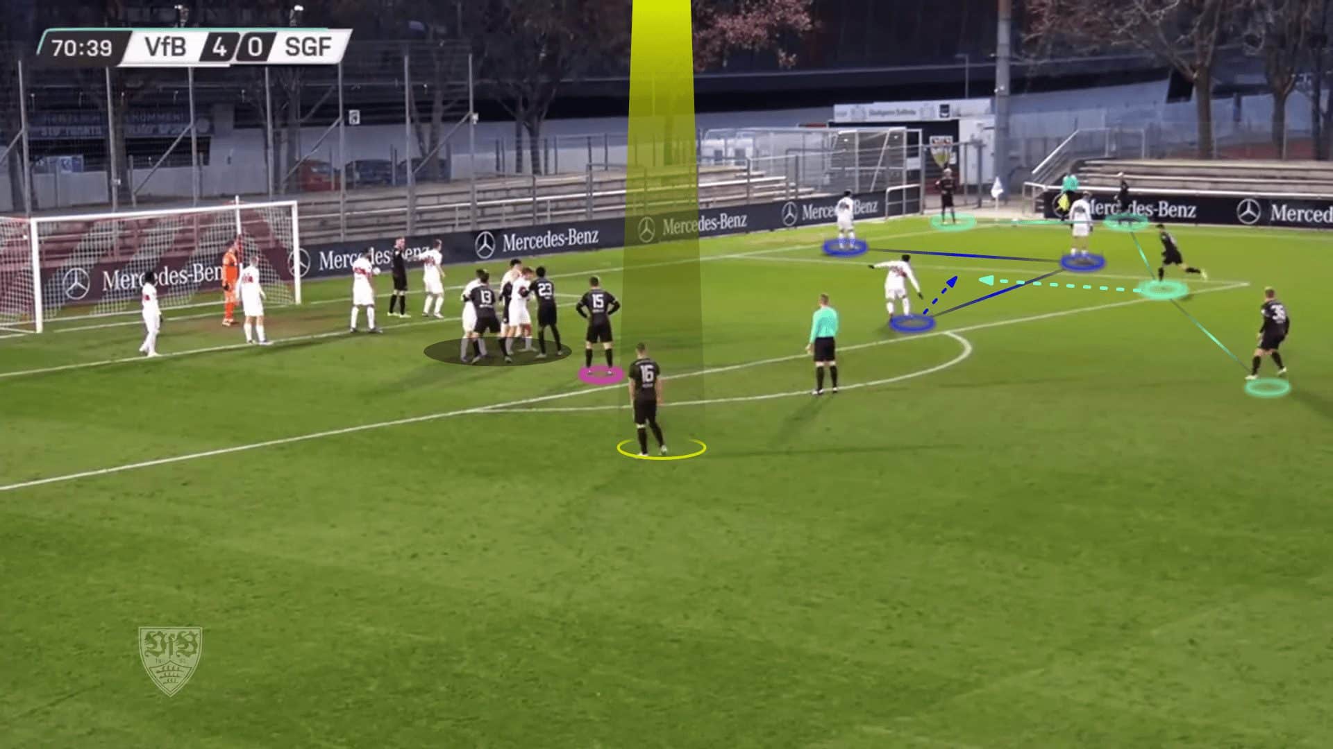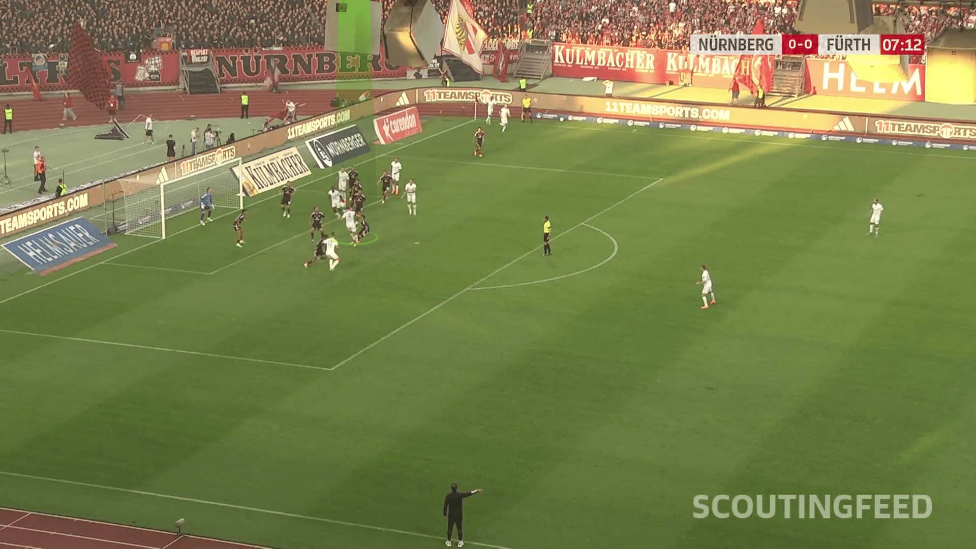 Going to an example to make the issue clear, the opponent defends with a man marking defending system with only two zonal players, two short-option defenders due to Greuther Fürth’s two takers and a rebound defender. In comparison, Greuther Fürth put a player on the near post to drag the two zonal players, a player on the far post, and four players in a stack, while the last one targeted the black area shown in the first photo.