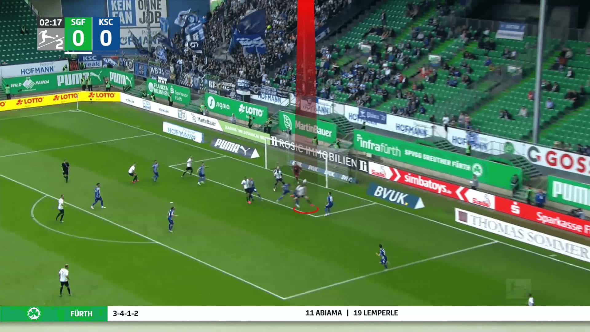 Greuther Fürth put four attackers close to each other, while the last attacker is the targeted player who stands behind two attackers to block the last two defenders. In contrast, an attacker blocks the first defender, preventing him from going to the pass, as shown in the two following photos below.