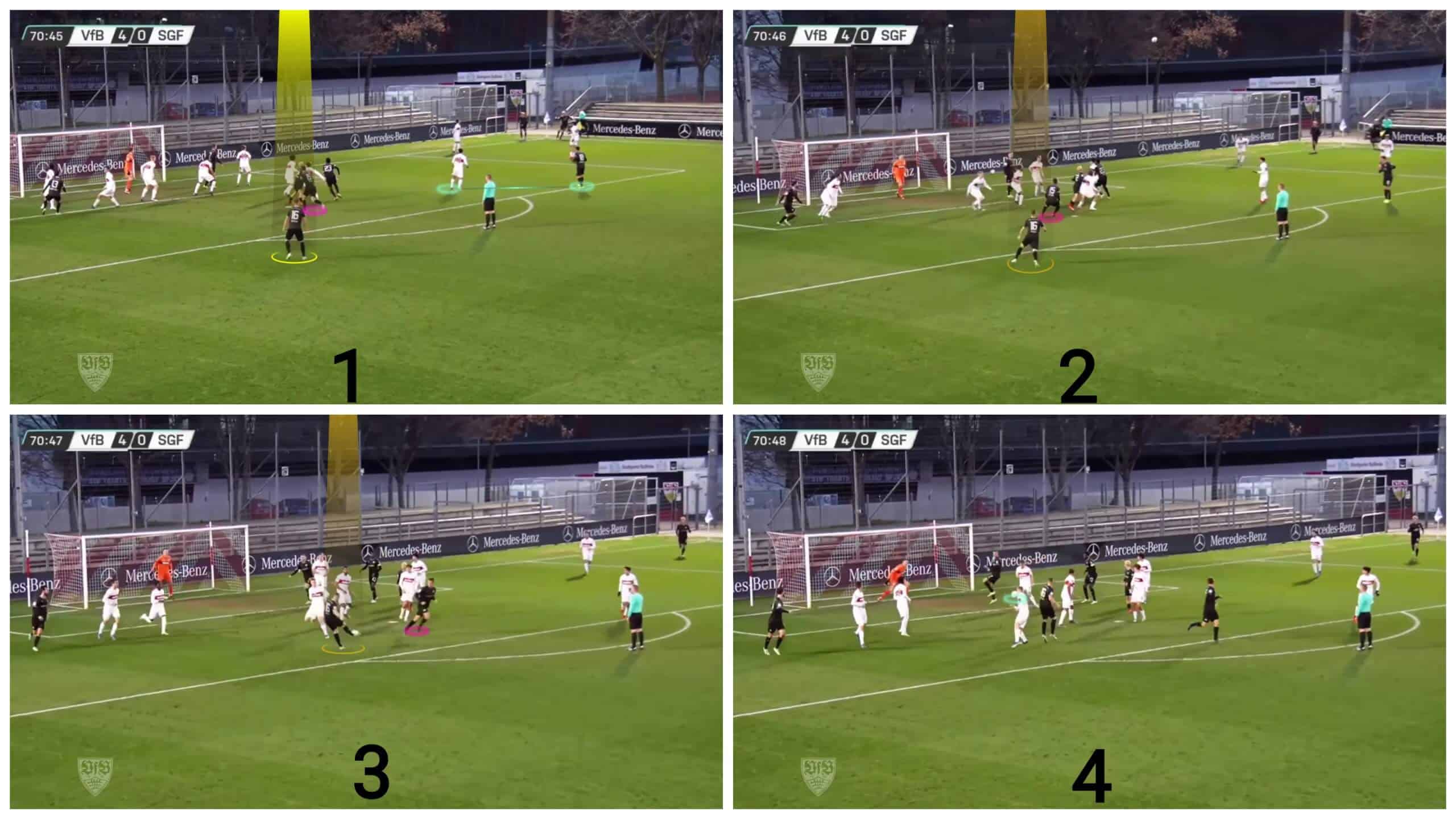 In the second photo, we want to focus on the main difference between the body shapes of the marker in the middle and the marker at the targeted area. You will find that the first one is optimum for tracking the attacker and the ball simultaneously, giving his chest to the attacker and his back to the goal, standing inclined to keep tracking the ball and the attacker. In contrast, you can find the opposite thing at the targeted area where the marker gives his back to the ball, so he can’t track the ball and the attacker at the same time and can’t stand inclined leaving the attacker can run inside easily toward the goalmouth.