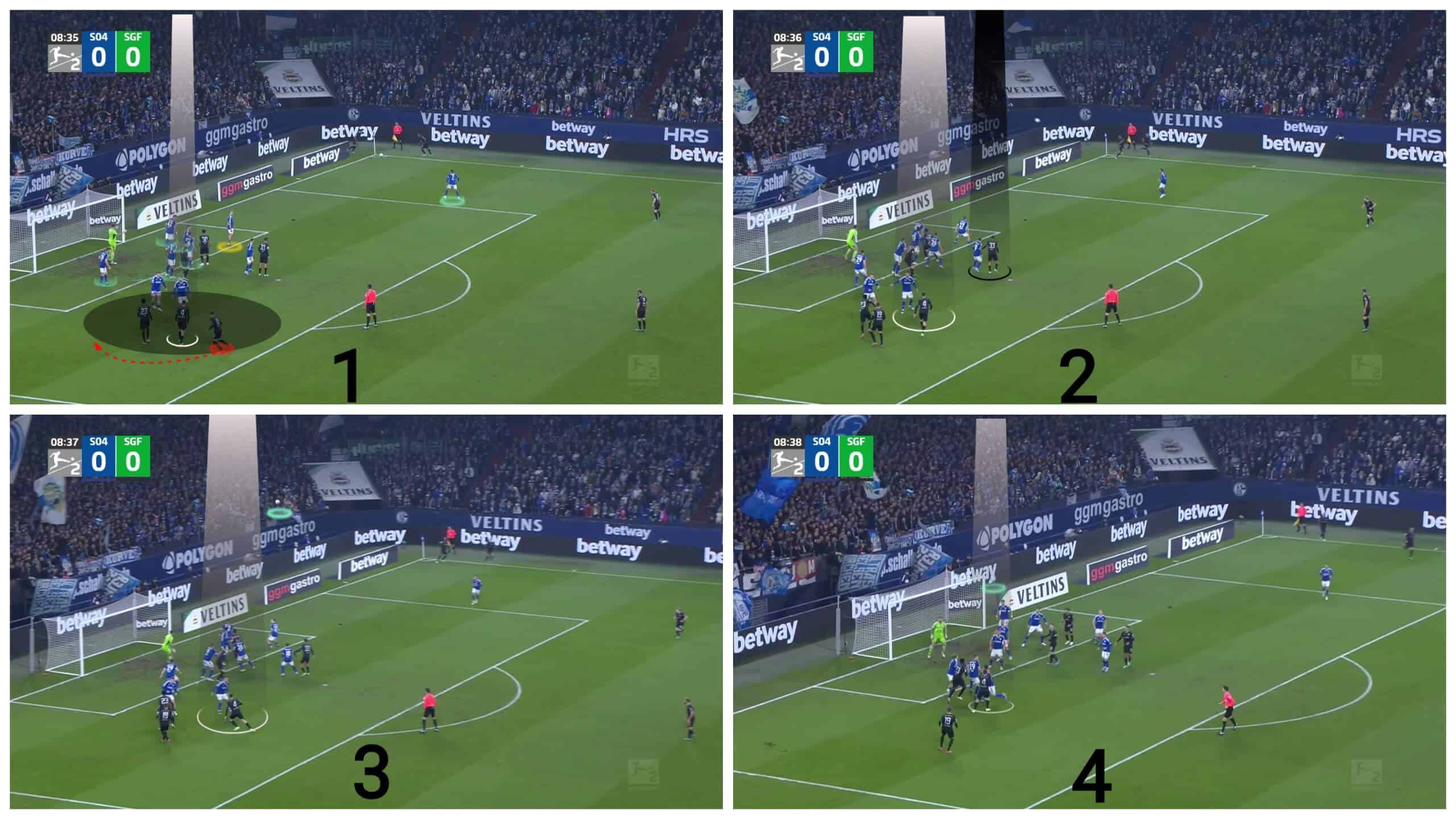 In the first photo, when the taker touches the ball, the three attackers drag their markers in many directions. At the same time, the pink player behind them goes into the box, dragging the attention of the zonal players who try to get out, as shown in the second photo. So the yellow player gets the ball kicking it, but it hits a defender, as demonstrated in the third and fourth photos.