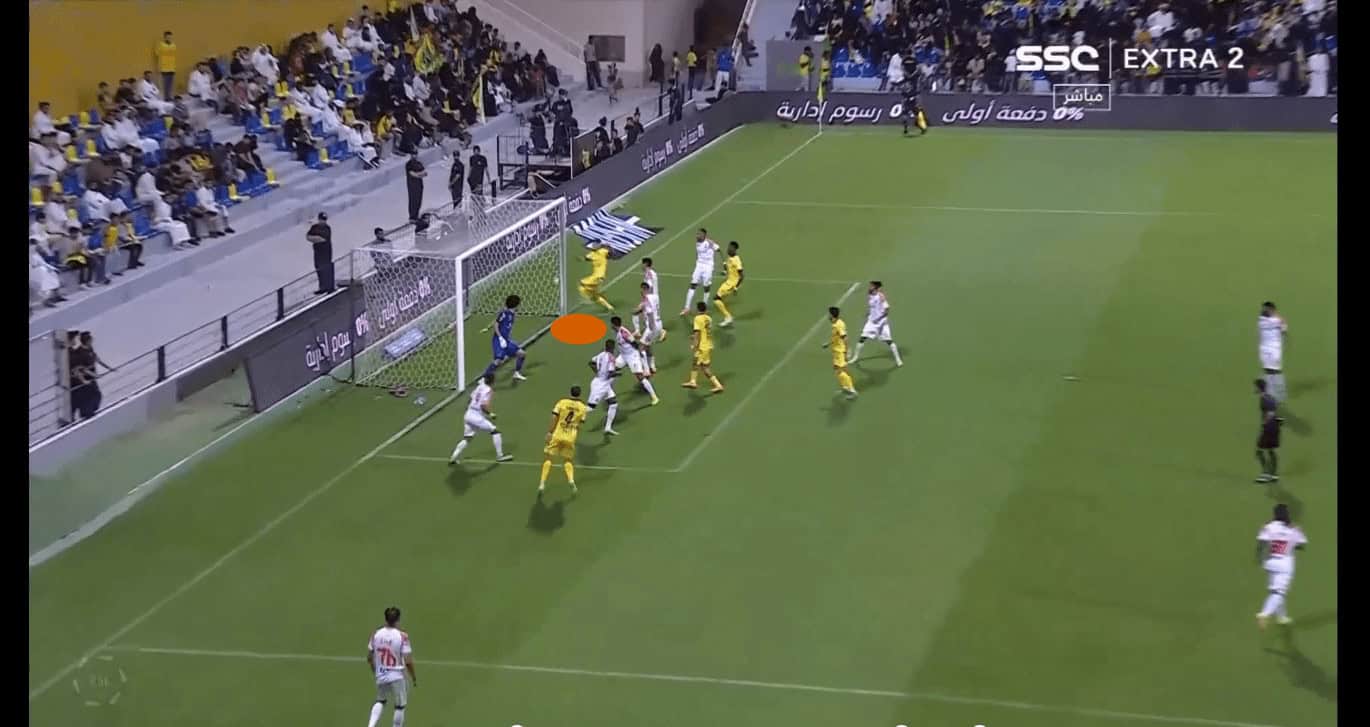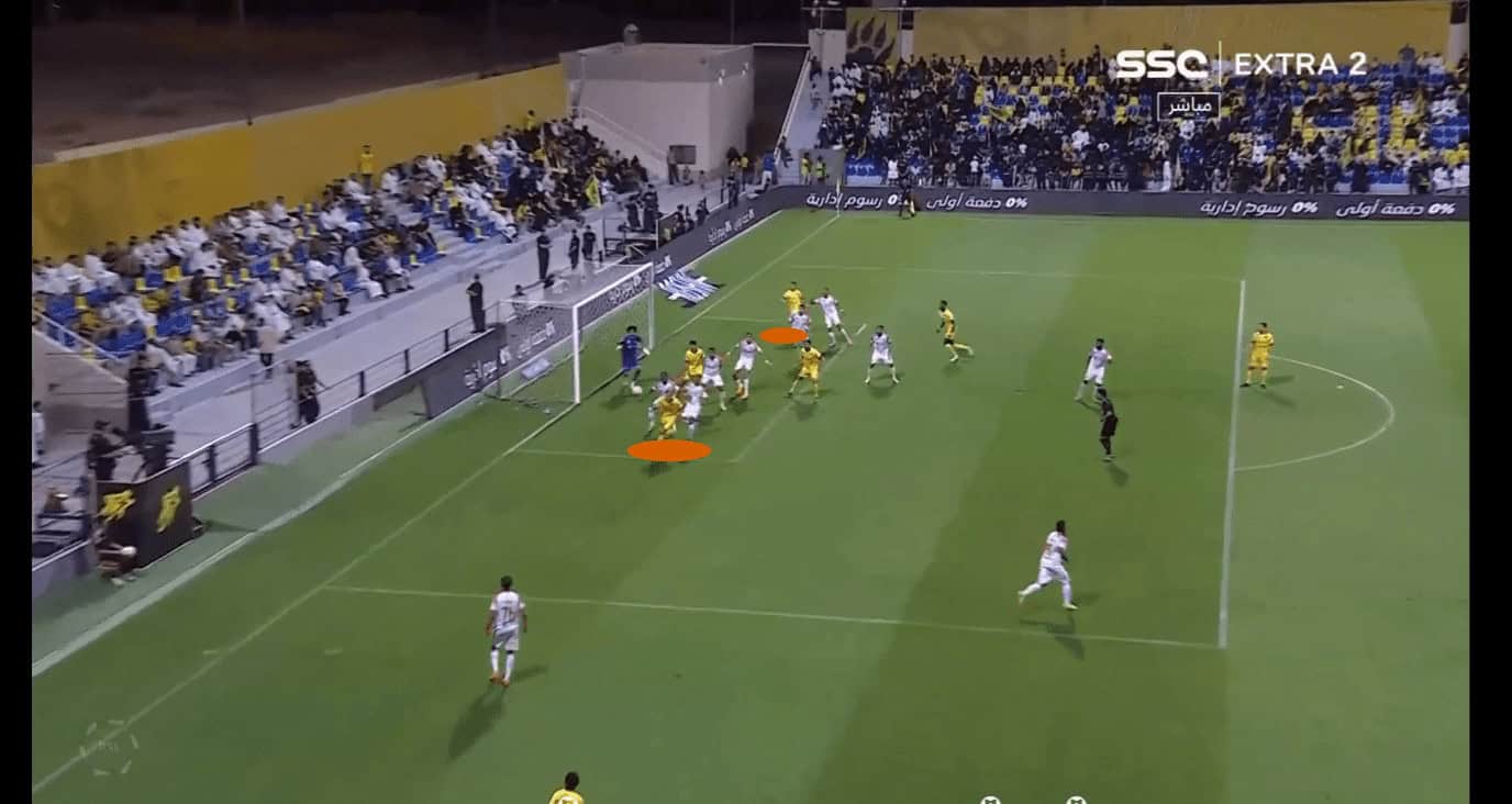 In the first photo, Al-Nassr is defended by zonal defenders, in green, in the first zonal line, including the near-post defender, standing on the edge of the six-yard because the cross from a left-footed player will be an out-swinging cross, and this gives the orange attacker, who sticks with the goal, the space to move back receiving the cross later. They also have three man markers in the black circles, so we have two orange players free from man-marking.