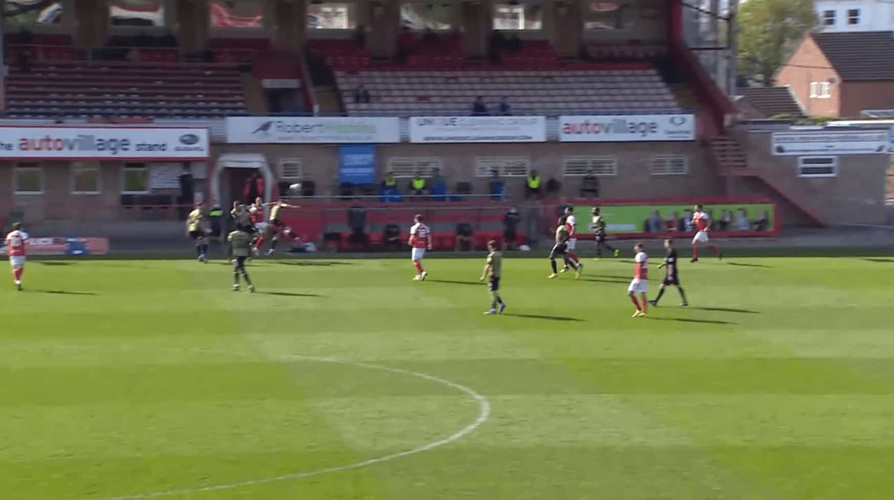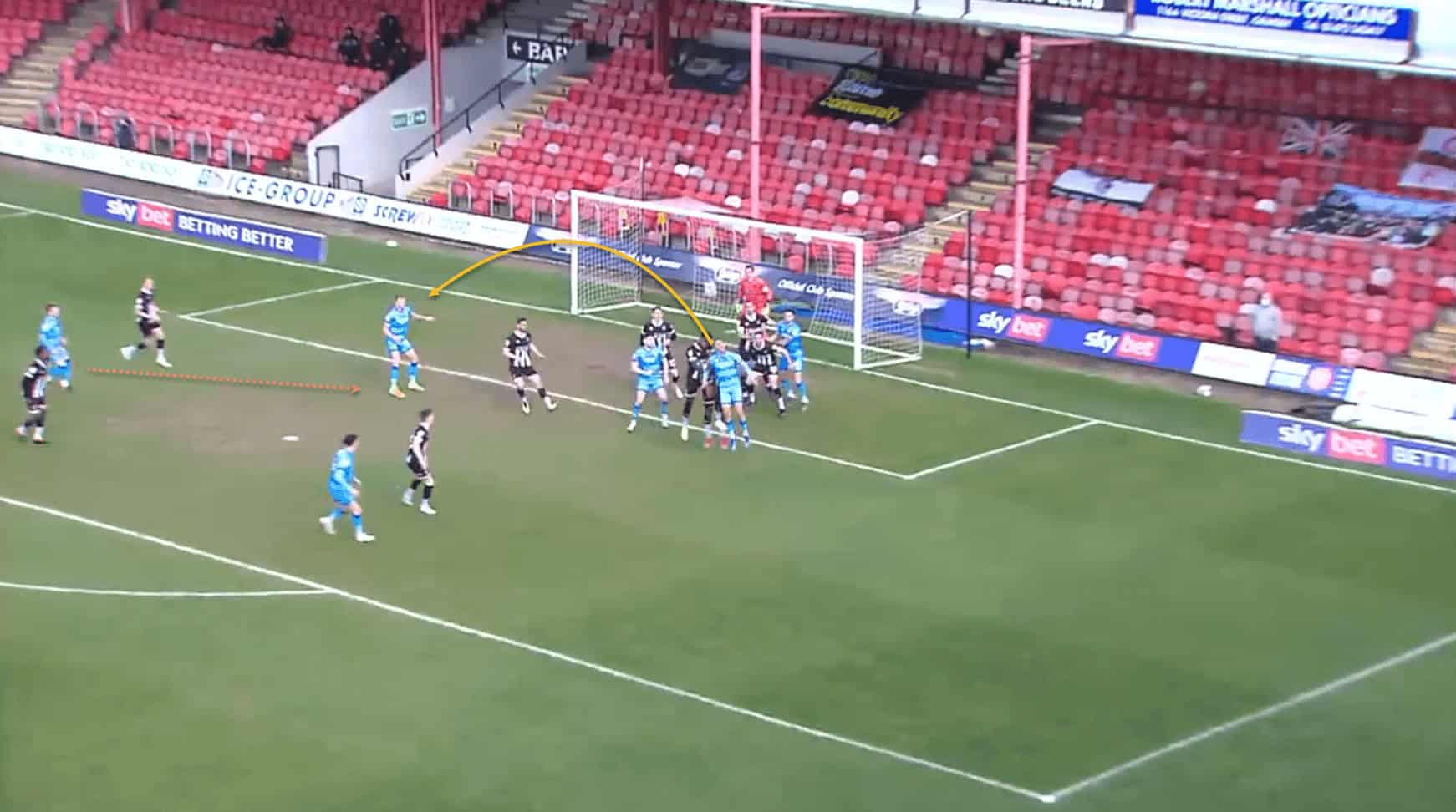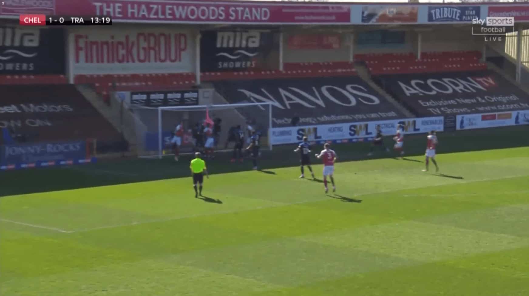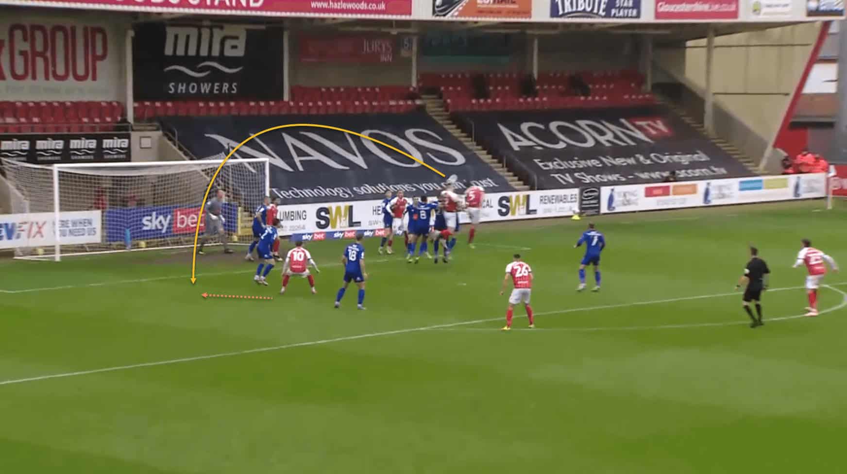 In this case, the Cheltenham player wins the initial header, flicking it on for Alfie May at the far post, but the ball is just a little away from him, and he cannot get a clean connection on his shot.