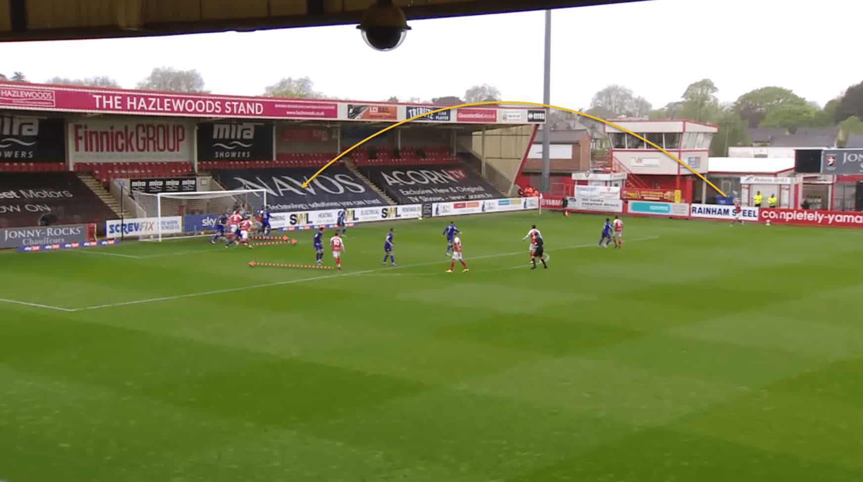 Again, the Cheltenham player wins the initial header and can flick it on to the back post, where it just evades his teammate, who had held his run and stayed at the far post rather than coming out to the near post.