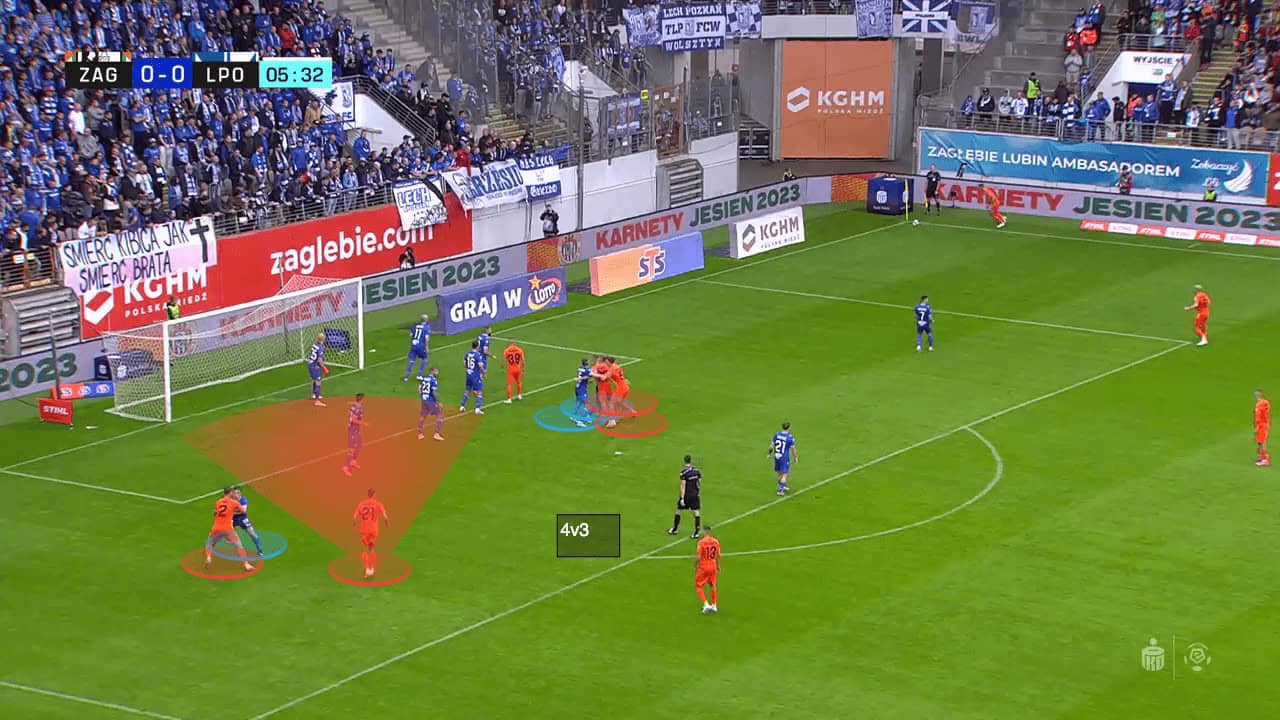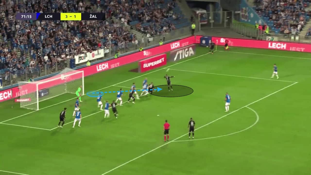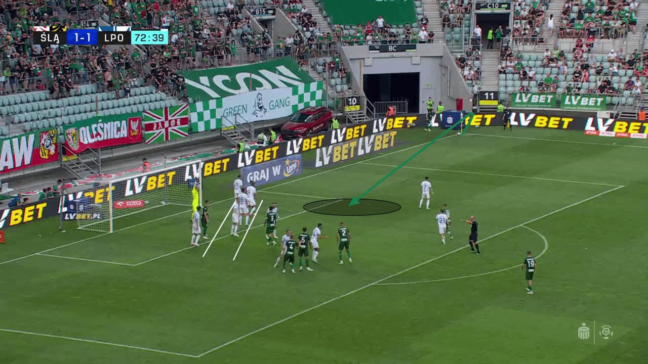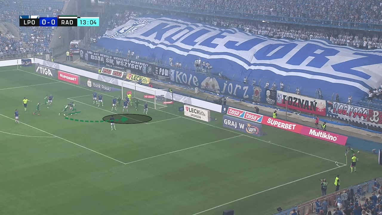 With these overloads, opposition teams can create these 2v1 scenarios and use weaker aerial players to distract or block defenders in order to create space for the strongest aerial players. Without sufficient man-marking numbers, Lech Poznań are highly vulnerable during corners, mainly because of the ability to oppose teams to deliver the ball to the strongest headerers regularly.