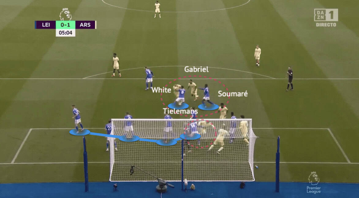 Arsenal attacked by the diverse timing to move, White first, so they moved Tielemans away and opened a lane for Gabriel to run. When the Brazilian centre-back was on his way to attack the cross, very early and before reaching the penalty spot, Soumaré already lost Gabriel.