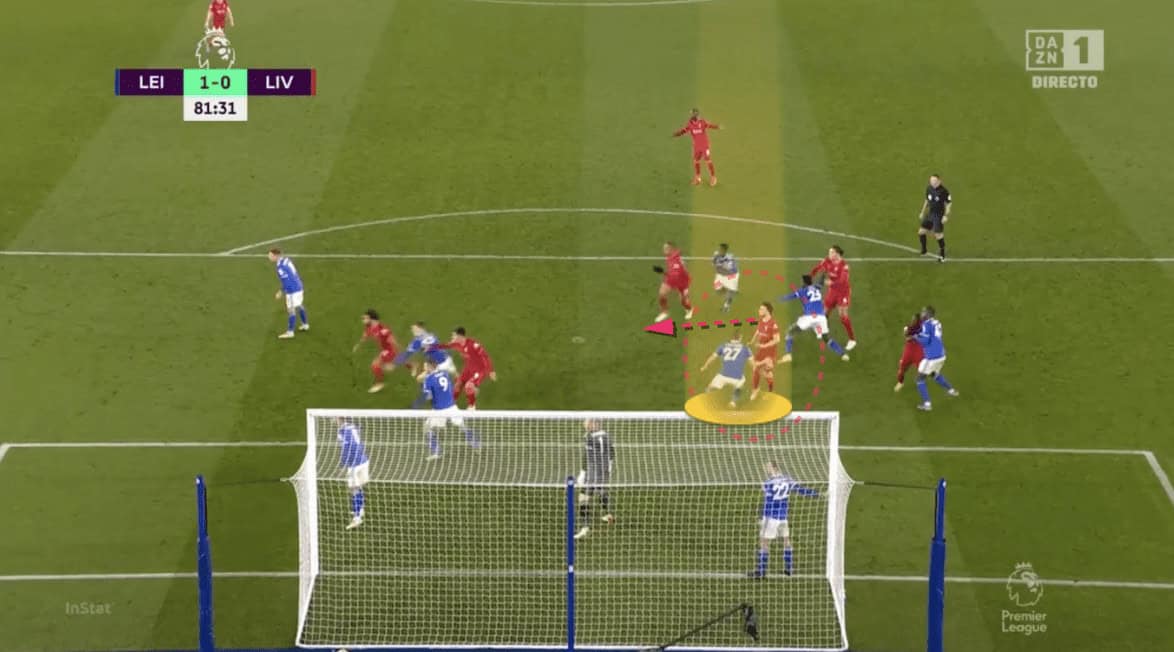 Here, since Daka was dragged away by the early runner, James Justin improvised by giving up his target (Jota), and competing with van Dijk because that was the instant danger. Expectedly, Justin was late to jump because he was not in the position before the ball arrived. Schmeichel made the first save, but unable to stop the Jota bounce. The Portuguese international was unmarked because Justin left him. Throughout the time, the post-player (Albrighton) could do nothing and watch the ball going in.