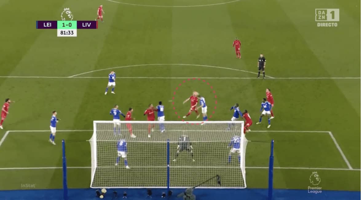 The above image from a higher angle shows a good picture of how Leicester’s new structure looks like. Apart from the zonal defenders, there was one player guarding the far post, without anyone in the near post. This is because Liverpool mostly delivered outswingers in the corners, with Andrew Robertson on the left and Trent-Alexander Arnold on the right side. If the opponents used inswingers, there would be two post-defenders.