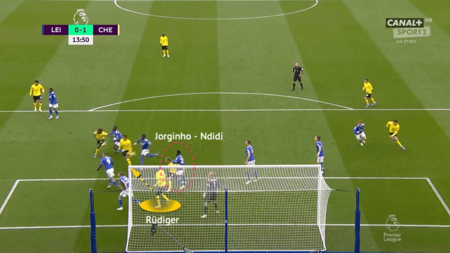 Meanwhile, Jorginho, who initially positioned himself between the zonal chain and Castagne, very cleverly sneaked in front of Ndidi as a screener, separating the Nigerian defender and Rüdiger.