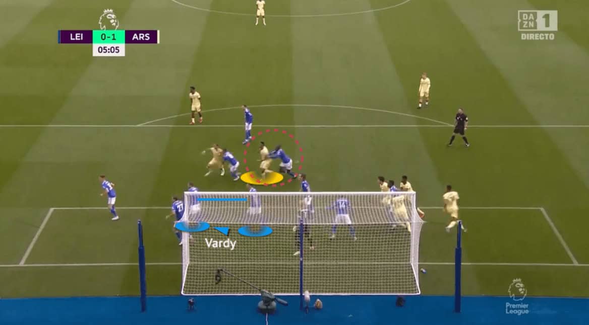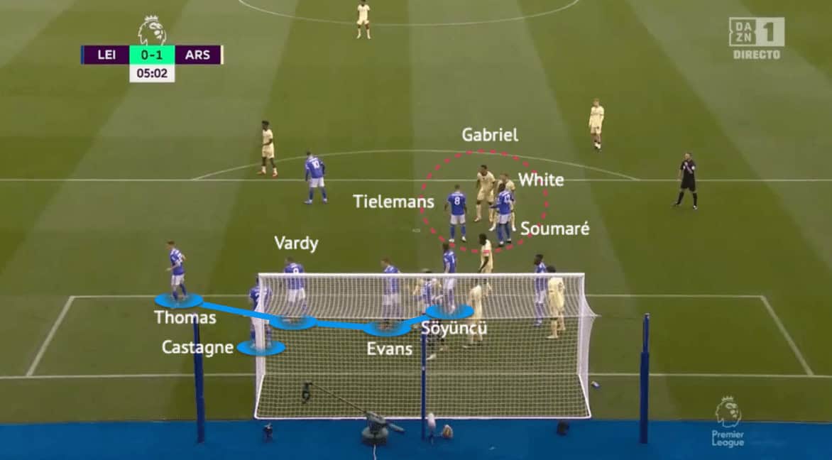 They conceded to Arsenal very early with the mixed approach this season. The zonal chain was formed by Thomas, Vardy, Evans, and Söyüncü, while Tielemans and Soumaré were the man-markers, dealing with the most dangerous opponents (Ben White and Gabriel Magalhães.