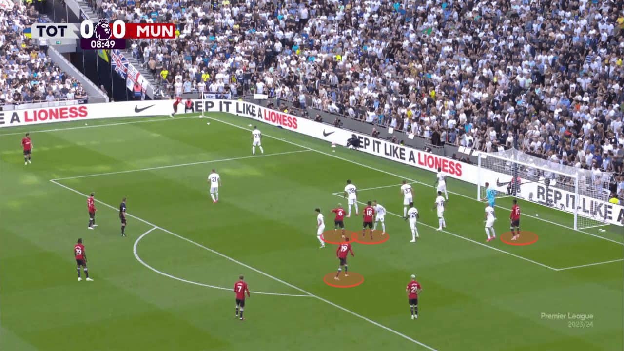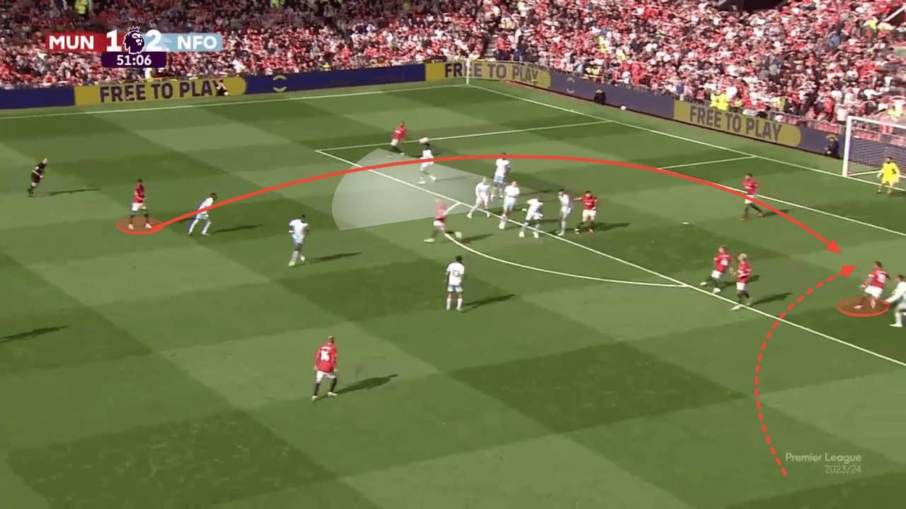 Set plays have played a particularly crucial part in this poor start of the season, with United having conceded three goals from dead balls in the Premier League already, as well as giving away a penalty from a corner against Bayern, getting away with a potential penalty shout against Wolves and conceding a goal directly after an attacking corner against Nottingham Forest in the opening minutes of the game. From an attacking point of view, Man United have struggled to create many chances from set plays. However, the exceptional aerial ability of Casemiro and his intelligent movement inside the box has allowed United to remain somewhat efficient from the limited chances they manufacture.
