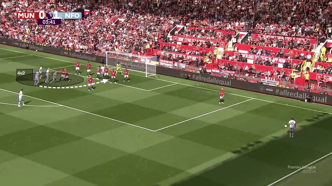 There have also been glimpses of creativity from wide free kicks, with a more trendy routine appearing across many leagues. With teams focusing on protecting one part of the box more than others, teams can use extra passes to distract defenders before exploiting the open spaces. For example, we can see the free kick being taken from the right wing below. The defensive unit is tilted towards the left-hand side of the box. To increase the space available on that right side, the ball is switched to the left-hand side, where United know the ball will be pressured.