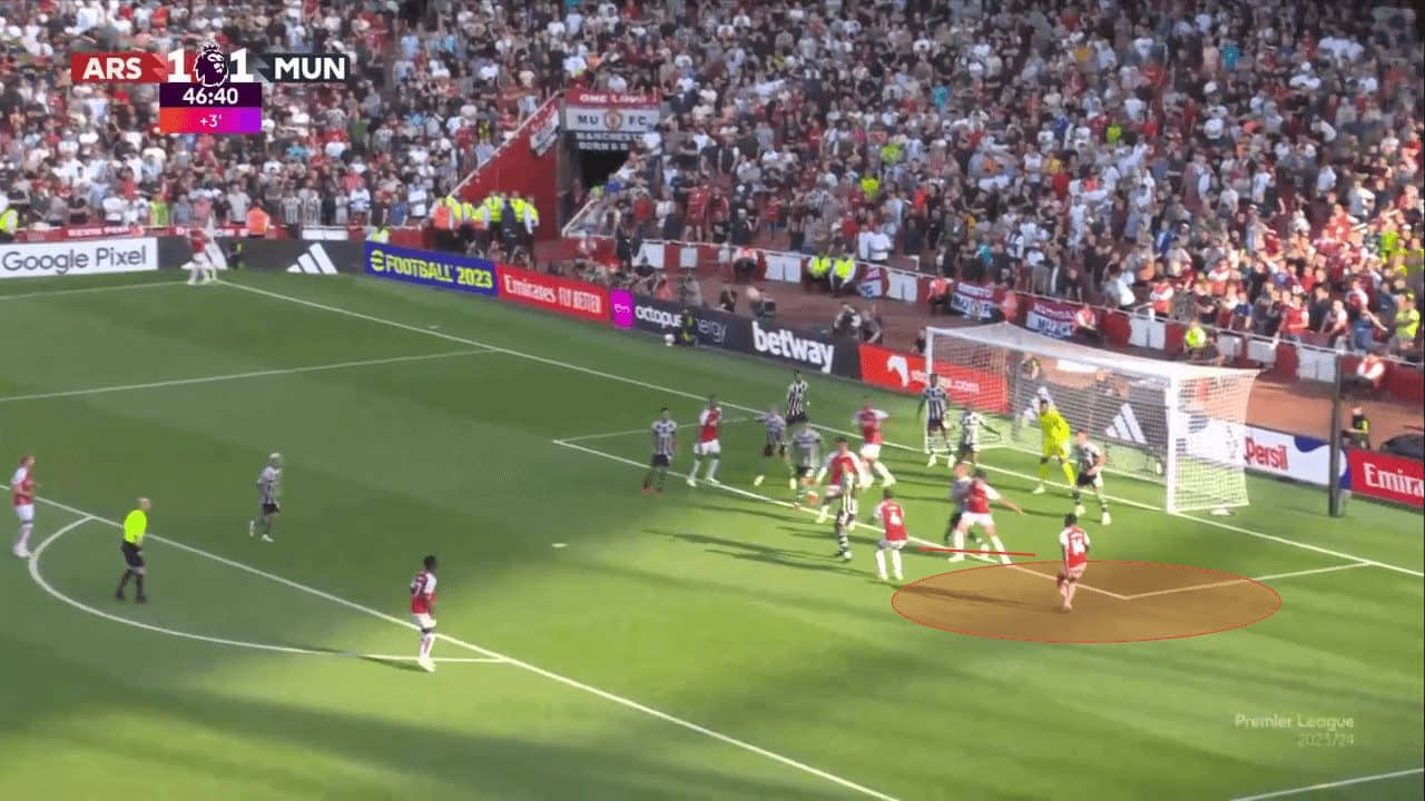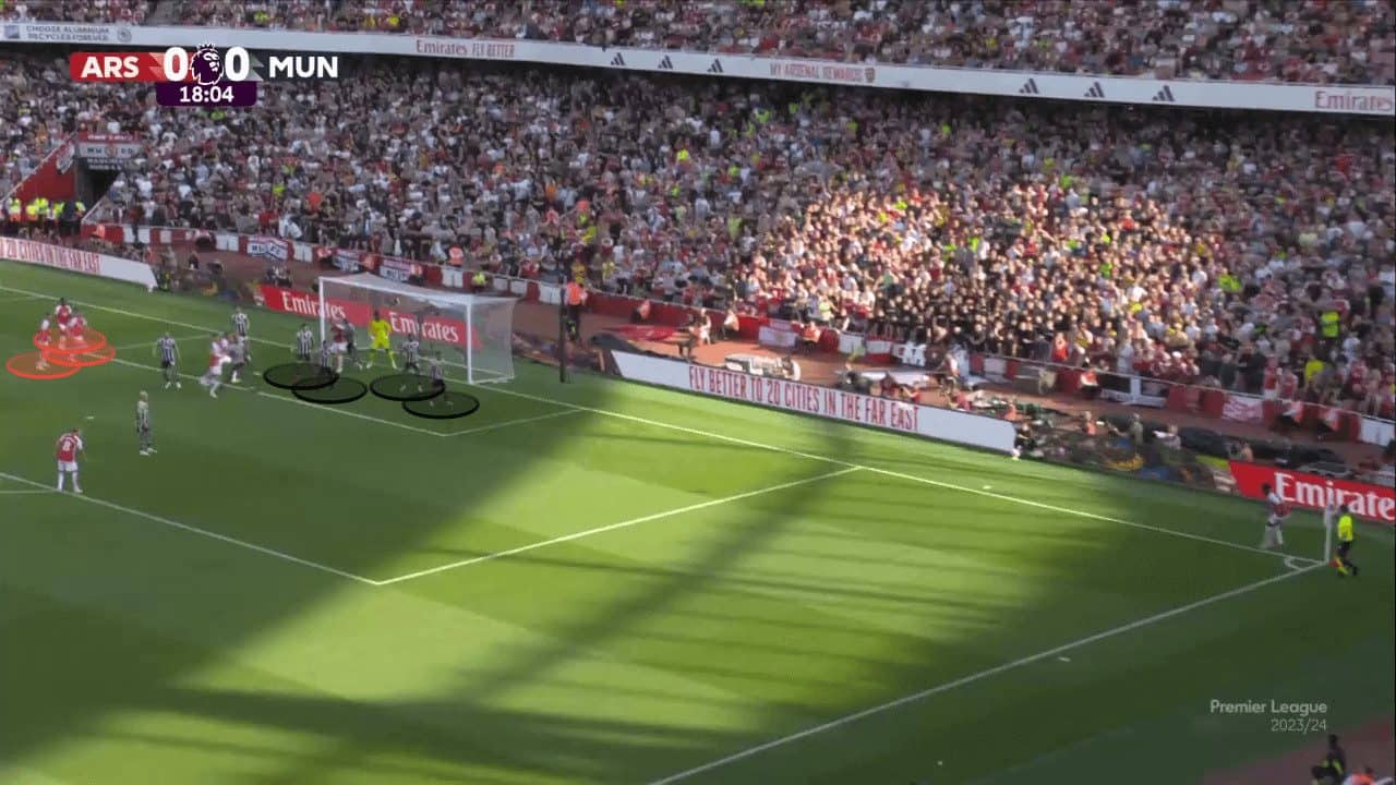 The most glaring issue of this zonal system is that it doesn’t consider the starting positions of the attacking side. As shown in the image below, United leaves around four zonal markers protecting the near post, whilst Arsenal’s attackers are waiting at the back of the six-yard box to attack the ball. Not marking every attacking option means that at least one attacker will have the opportunity to run towards the ball and time the jump and header for the aerial duel precisely at the right moment.