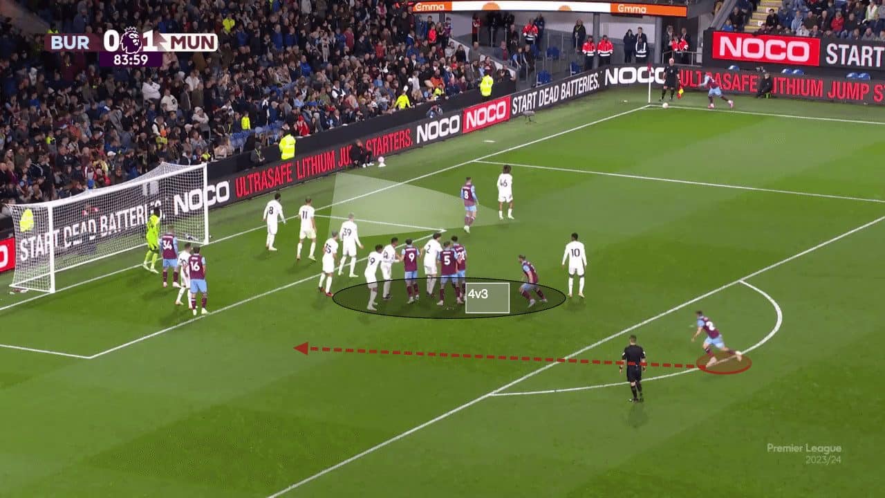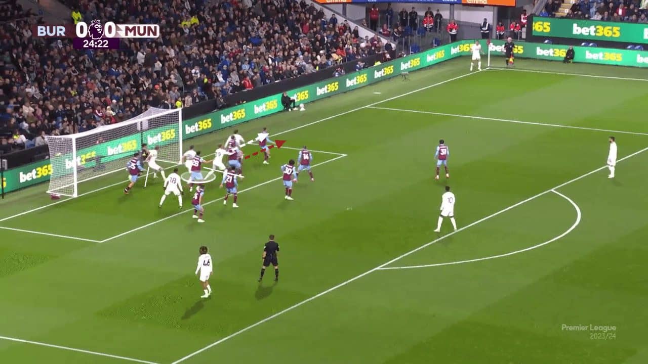 As mentioned above, the heavy, near-post zonal defending can cause other problems for Man United. With them being outnumbered around the penalty spot, one attacker has the ability to compete for the ball without disruption. Furthermore, the heavy zonal positioning, which focuses on the near side of the six-yard box, also leaves bigger spaces in the back half of the six-yard box. With one back post defender being occupied by an attacker, the nearest free player who can attempt to attack the ball can be seen in the middle of the six-yard line, looking directly at the ball (#35). Jonny Evans has his body positioned perpendicular to the goal, meaning that his back is facing the back post, and any ball aimed over the top of his head towards the back post will be tough for him to reach and attack optimally. This provides Burnley with the opportunity to allow one attacker to arrive at the back post and have the running advantage to help him win the aerial duel over a backtracking defender.