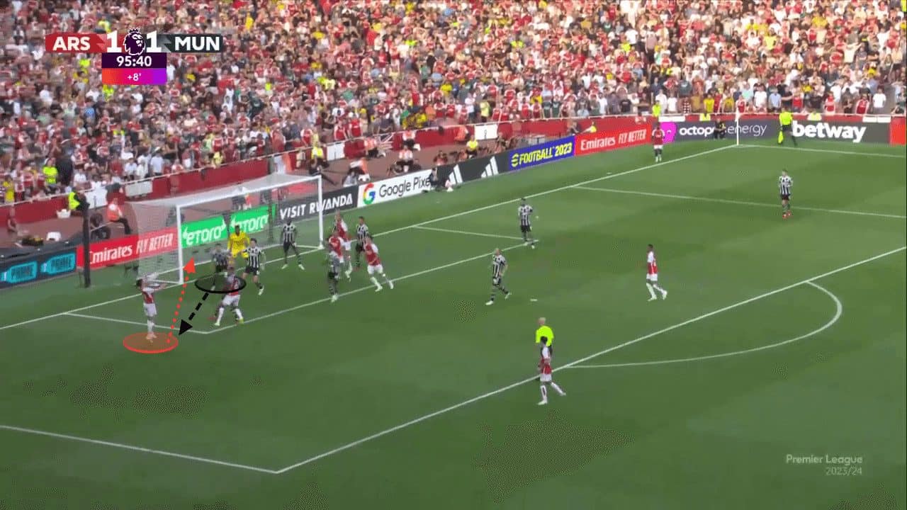 In the example below, Hojlund is preventing the goalkeeper from claiming the cross, whilst Scott McTominay uses a screen to create space for Jonny Evans to compete in the aerial duel 1v1 with his marker. Although Evans still has competition for the aerial duel, the fact that it is in a high-value area, within six yards from the goal, means that Evans does not need to generate power on the header but only make the first contact and redirect the ball into the back of the net. Lindelof also makes a decoy run away from the target area to give Evans more space to compete for the ball.