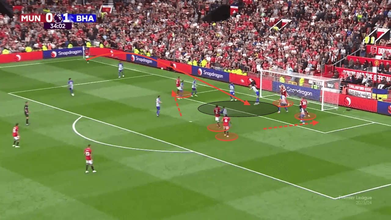 Something that has started to change recently with Hojlund’s introduction is the lack of obstruction on the keeper. In the opening weeks, many corners were easily intercepted by the opposition goalkeeper, who had the ability to come out and claim the ball. However, Rasmus Hojlund seems to have taken matters into his own hands by taking on the responsibility to sacrifice himself and block the keeper from coming off his line to provide his teammates with more opportunities to win aerial duels. I believe United could reassign the role to a weaker aerial threat, as the number of strong aerial players they have is small, and Hojlund should be on the end of the crosses rather than aiding others.