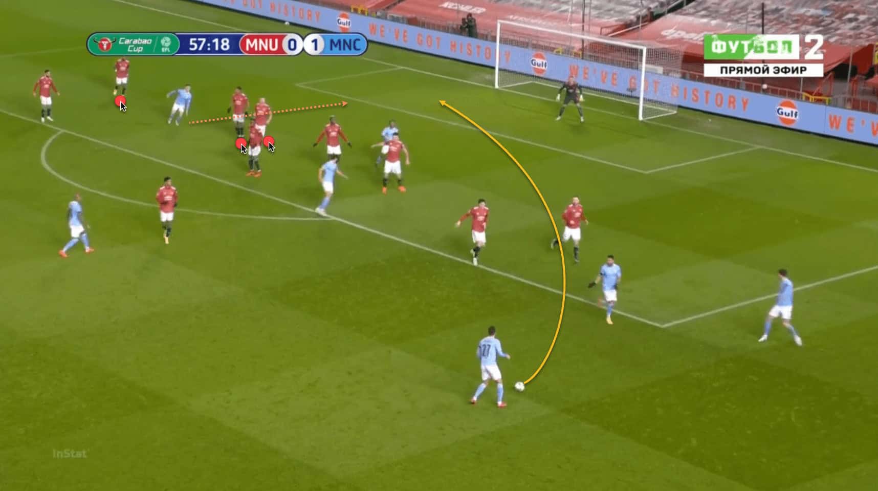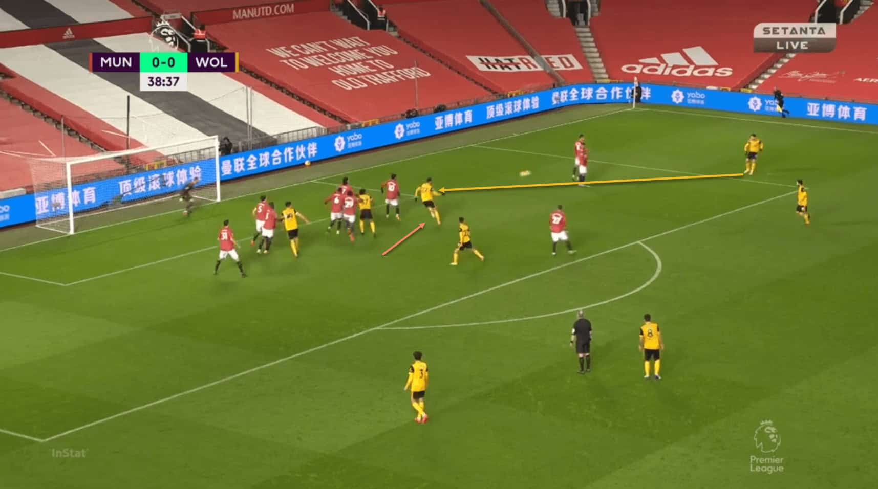 Neto delivers a flat, fast ball towards the near post, which Saïss meets with an improvised flick, forcing De Gea into a good save at his near post. Marcus Rashford is caught out by the run from behind him here, but Cavani should not have let the Moroccan international get away in the first place.