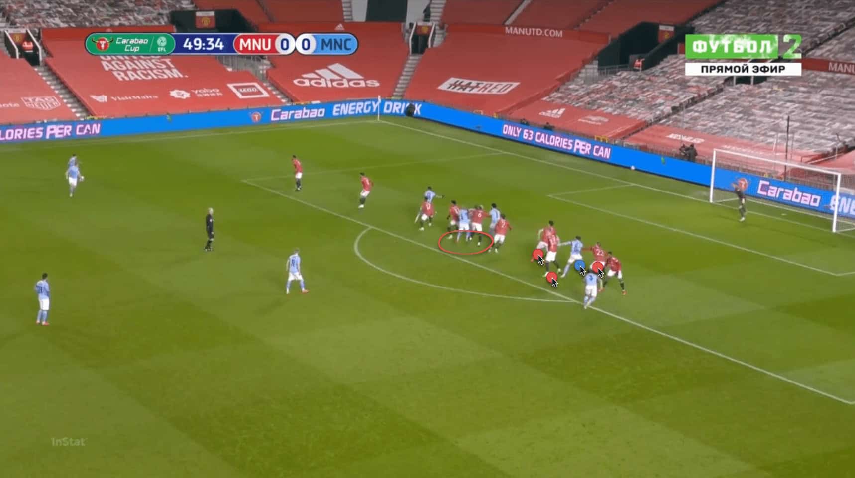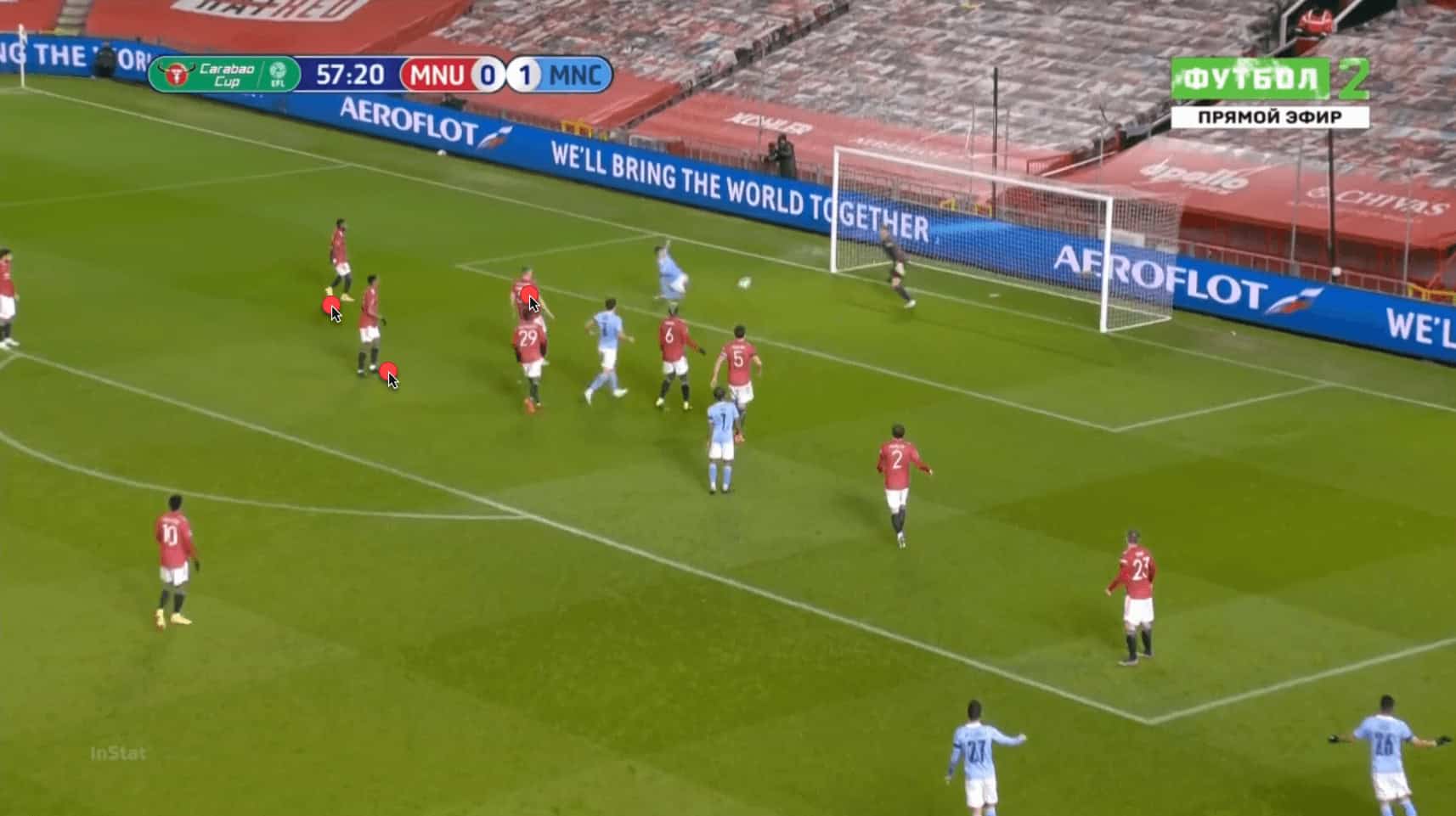 This goal conceded against Manchester City in the Carabao Cup semi-final is a prime example of United’s defenders losing focus. Note that John Stones is towards the back of the United line, with Luke Shaw and Scott McTominay in close attendance, while Raheem Sterling is at the front, with Paul Pogba and Lindelöf close to him. United actually have numerical superiority in the box at this time, but still manage to concede.
