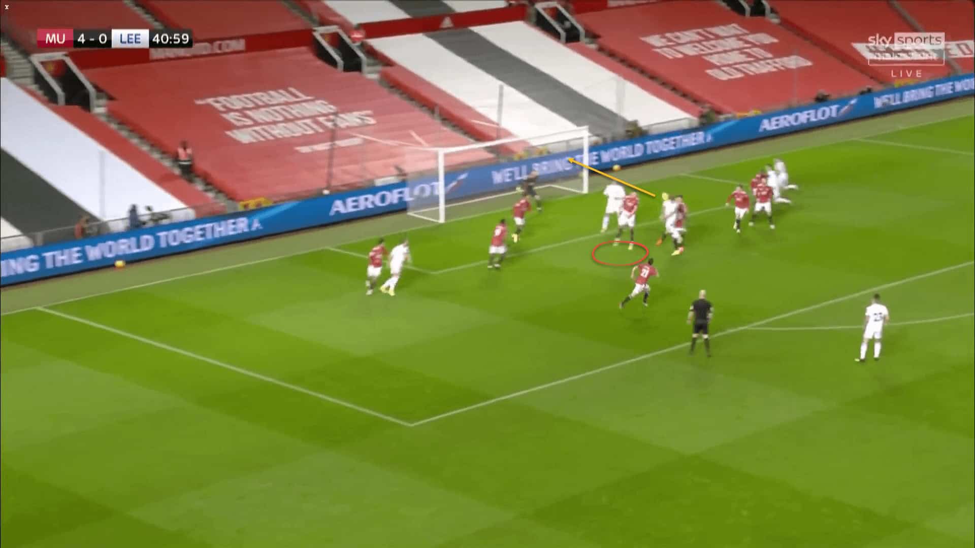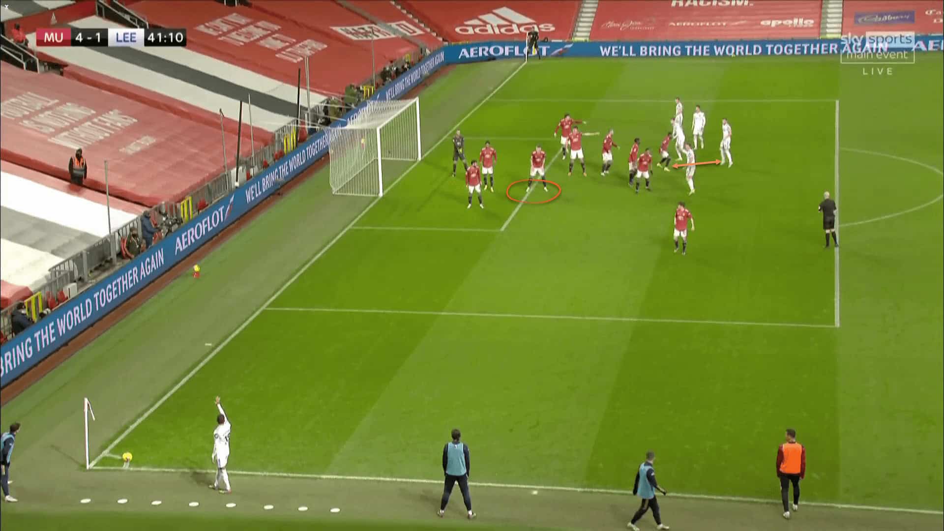 This was the first goal that Leeds scored at Old Trafford, through their captain, Liam Cooper. Scott McTominay (highlighted in red) seems to be the guilty party at first, but upon deeper digging, we see that this is not the case.