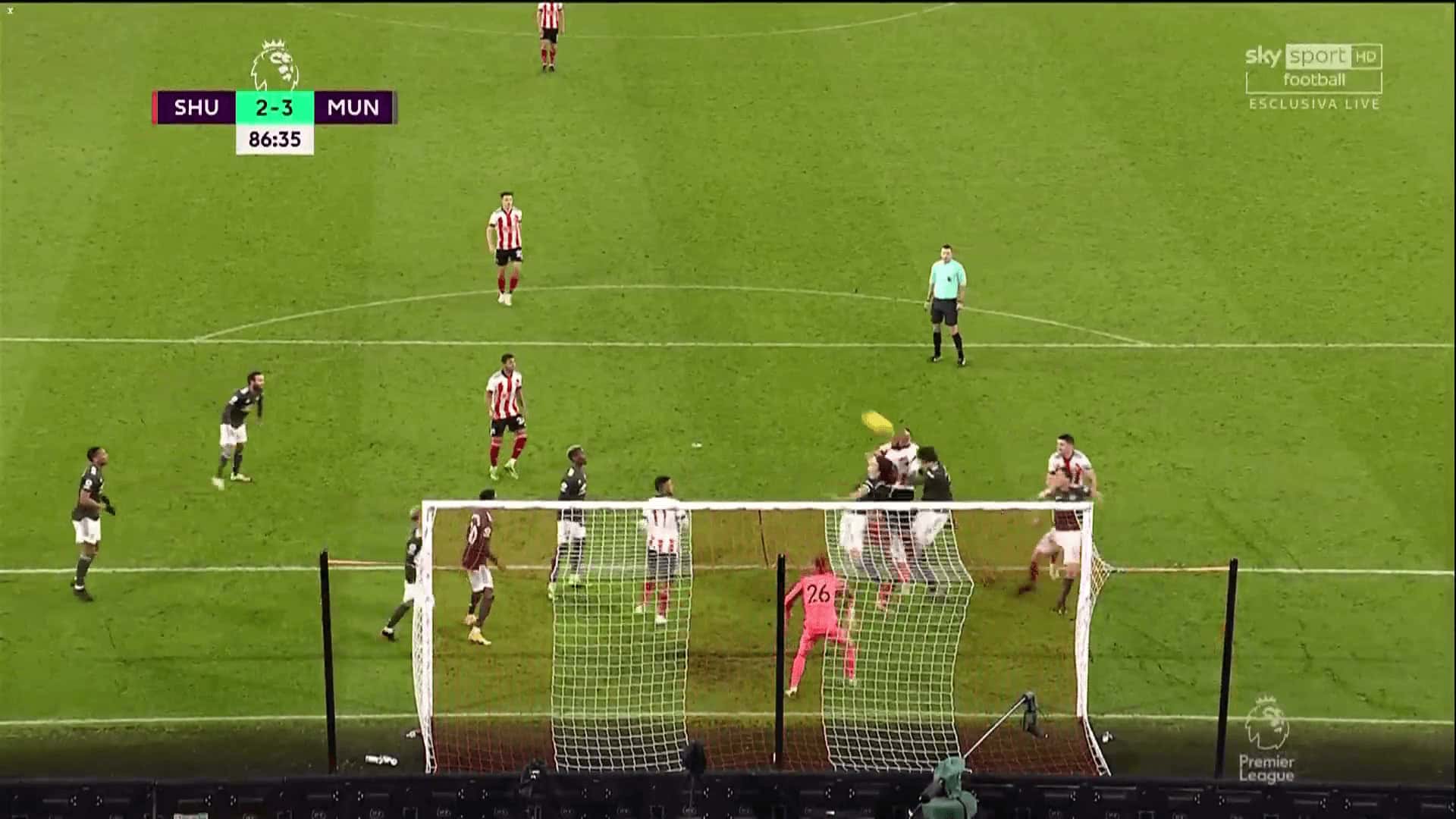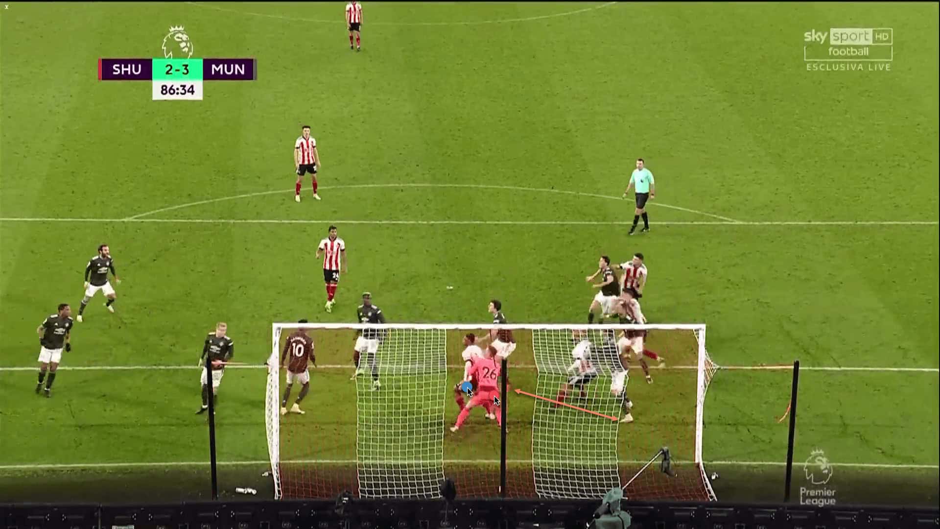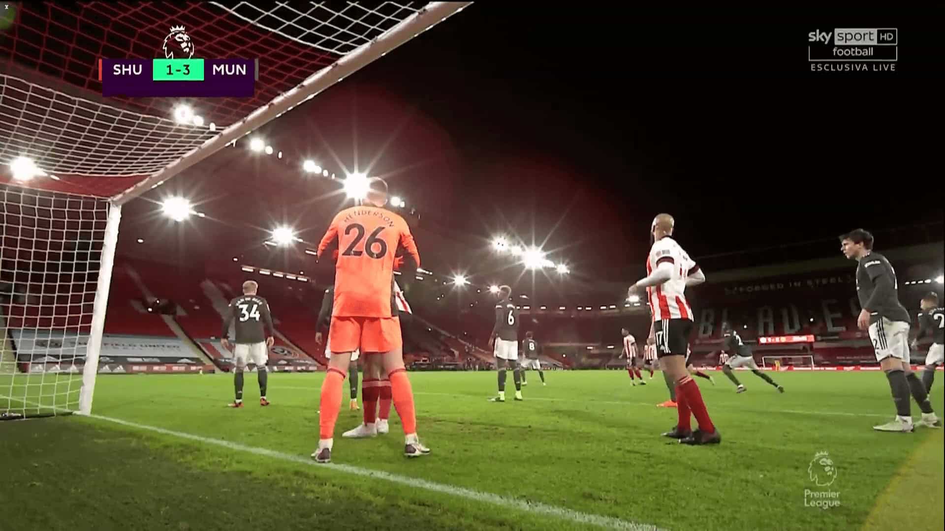 Seen from behind the goal, we begin to see some of the issues. Note, first of all, how Lys Mousset has pinned Dean Henderson, preventing him from coming out to claim the ball. This has been an issue with both David de Gea and Henderson, even though the Spaniard has improved tremendously in this regard since he first arrived at Old Trafford. Both keepers have a tendency to get caught on their line and therefore not be able to come out and punch or catch the ball, although there is a case here for one of United’s players providing better protection to the keeper.